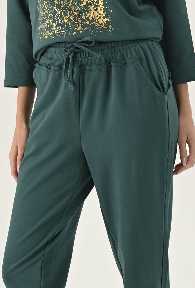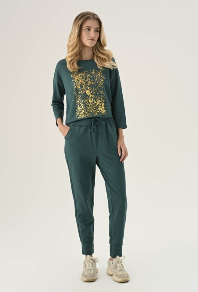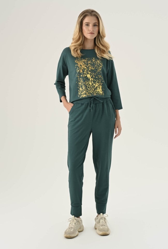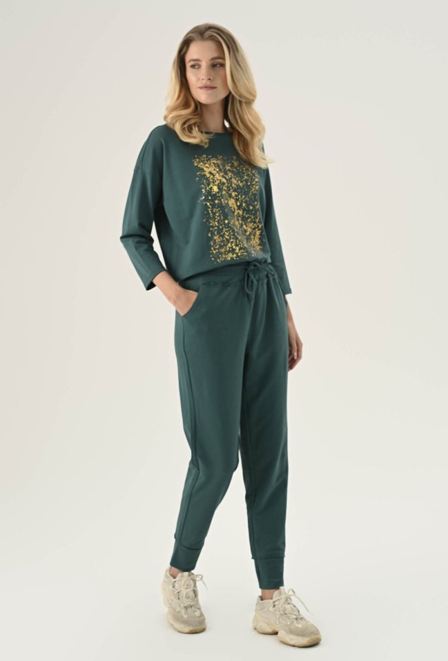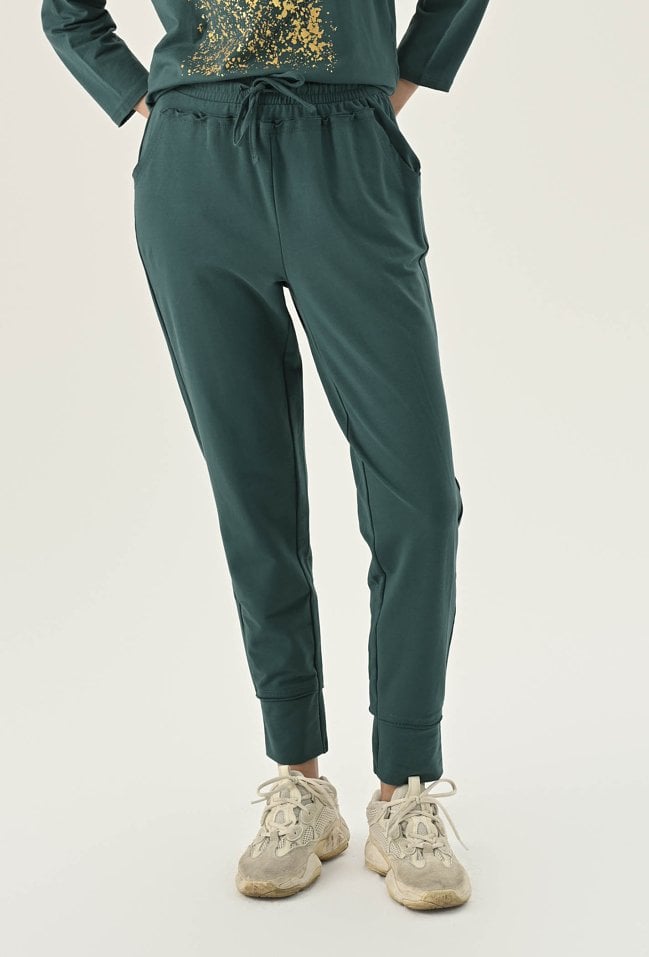 Stylowe i wygodne spodnie dresowe wykonane z miękkiej bawełnianej dzianiny to idealny wybór na co dzień. Zwężane nogawki zakończone wysokim ściągaczem nadają sylwetce lekkości i podkreślają sportowy charakter. Wysoka guma w pasie zapewnia świetne dopasowanie i komfort noszenia. Doskonałe do aktywnego trybu życia i codziennego relaksu. Modelka na zdjęciu ma 177 cm wzrostu i prezentuje rozmiar S.