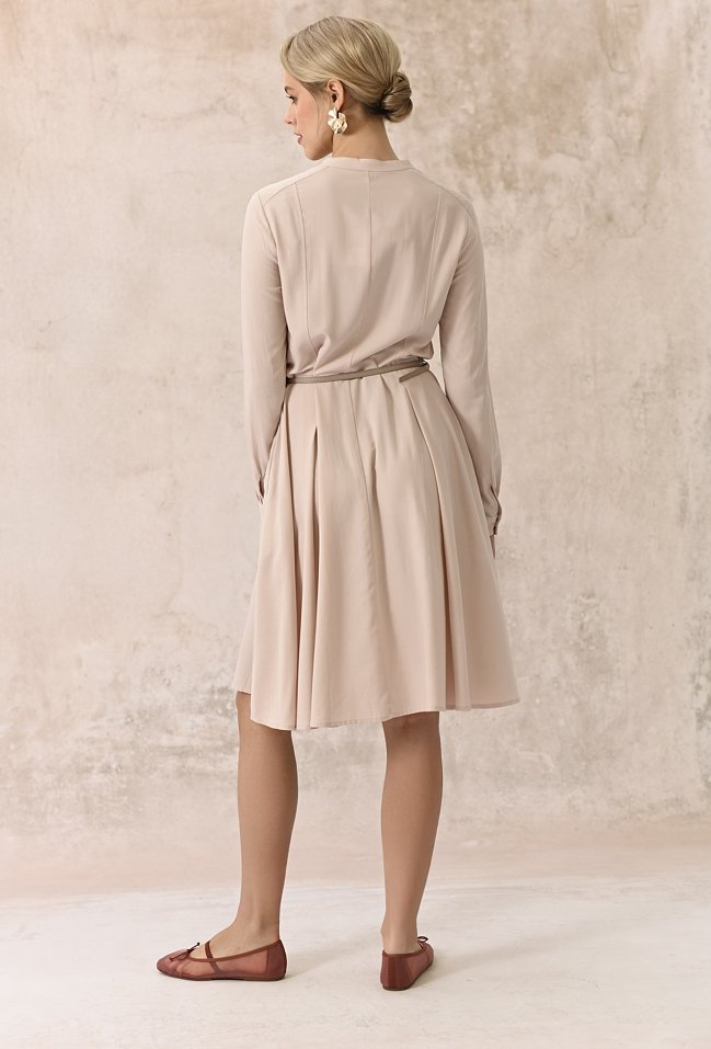Sukienka o lekko rozszerzanym fasonie, wykonana z gładkiej tkaniny w beżowym kolorze z przewagą wiskozy. Posiada delikatny dekolt w literę V. Długi rękaw zakończony mankietem oraz delikatne wcięcie w tali, które pięknie podkreśli naszą sylwetkę. Idealna na co dzień oraz na wyjątkowe okazje. Modelka na zdjęciu ma 178 cm wzrostu i prezentuje rozmiar 36.