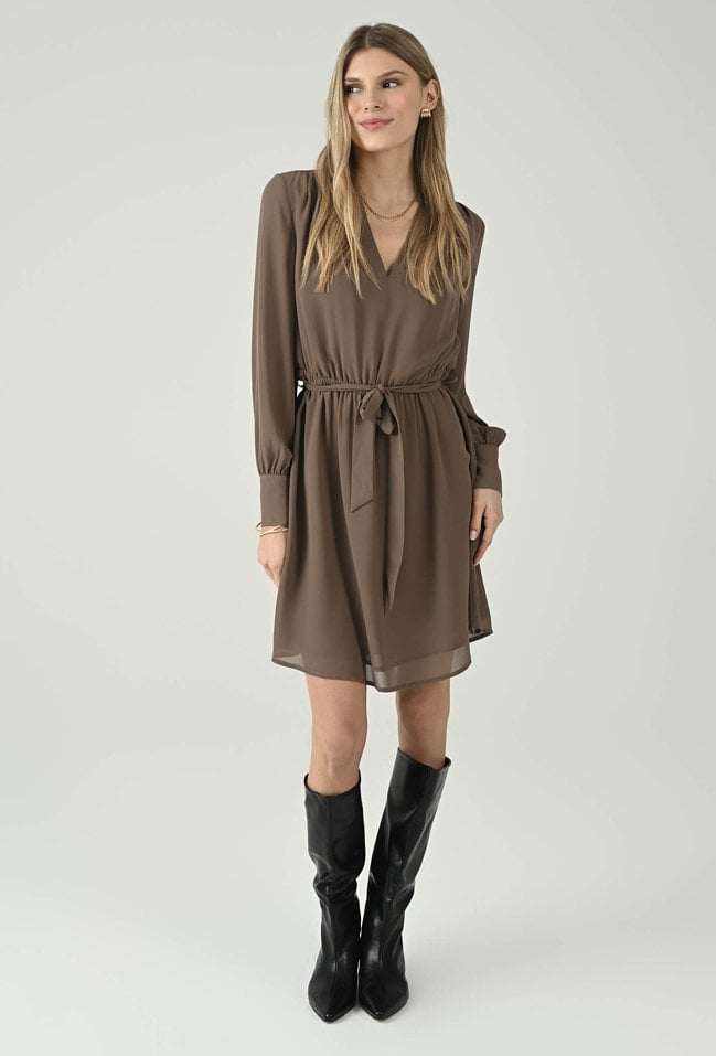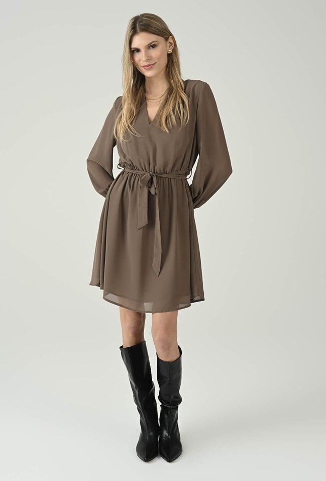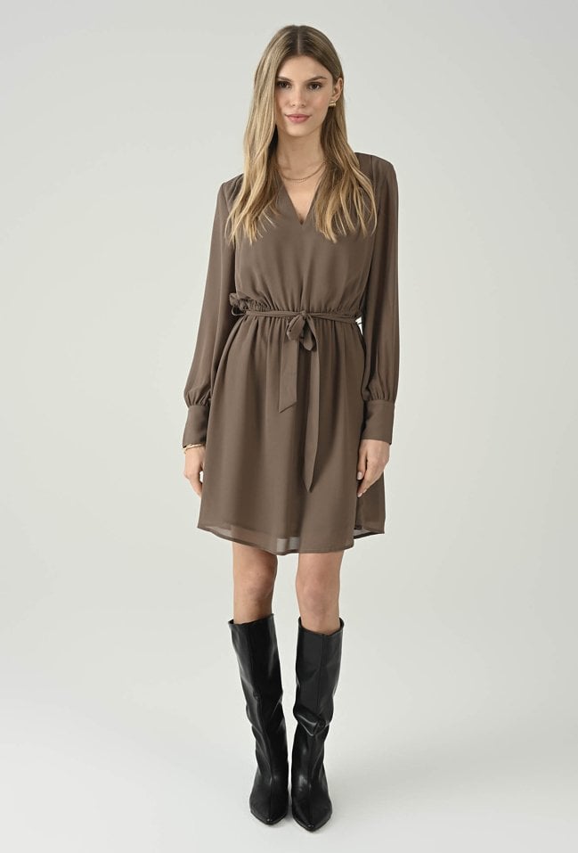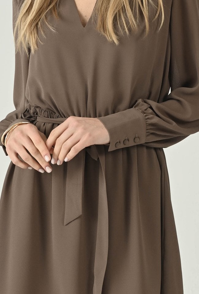 Kobieca sukienka w beżowym odcieniu, która zachwyca lekkością i eleganckim charakterem. Dekolt w kształcie litery V subtelnie podkreśla szyję, a wiązanie w talii pozwala dopasować fason do sylwetki i zaakcentować proporcje. Zwiewny materiał miękko układa się na ciele, a delikatnie rozkloszowany dół dodaje całości lekkości i swobody ruchów. Długie rękawy zakończone mankietami podkreślają dopracowane wykończenie, dzięki czemu model sprawdzi się zarówno na co dzień, jak i na bardziej wyjątkowe wyjścia. Wystarczy dodać botki lub szpilki, by uzyskać stylowy, dopracowany look.