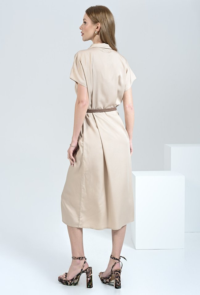Sukienka szmizjerka z przyjemniej w dotyku tkaniny z lyocellu. Sukienka posiada pasek doskonale podkreślający talię oraz krótki rękaw. Kieszenie wewnętrzne po bokach dodają sukience praktyczności. Zapinana na guziki po długości. Ten model to doskonała propozycja na co dzień! Modelka na zdjęciu ma 176 cm wzrostu i prezentuje rozmiar 36.