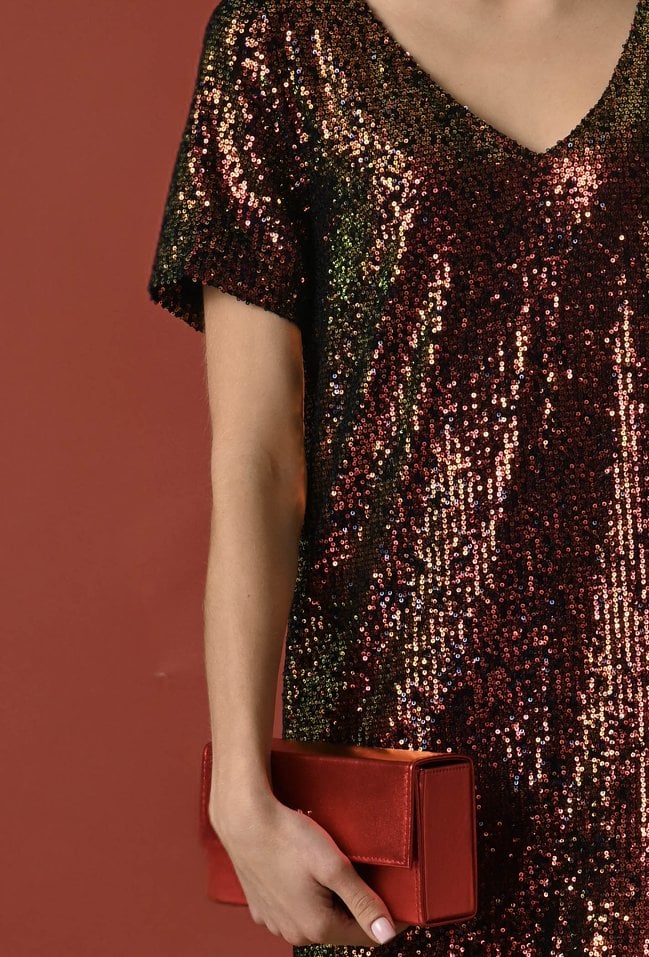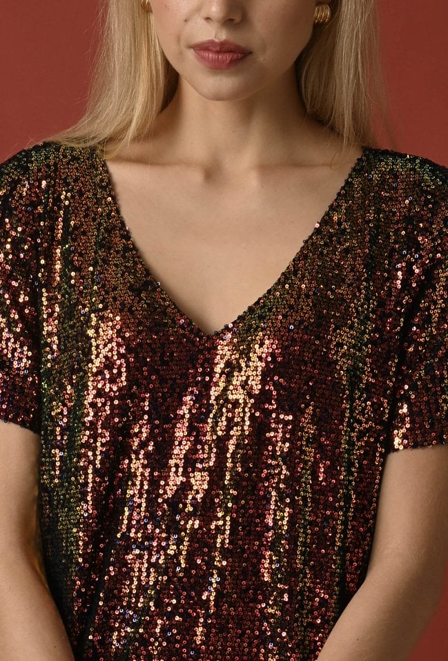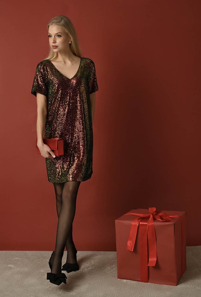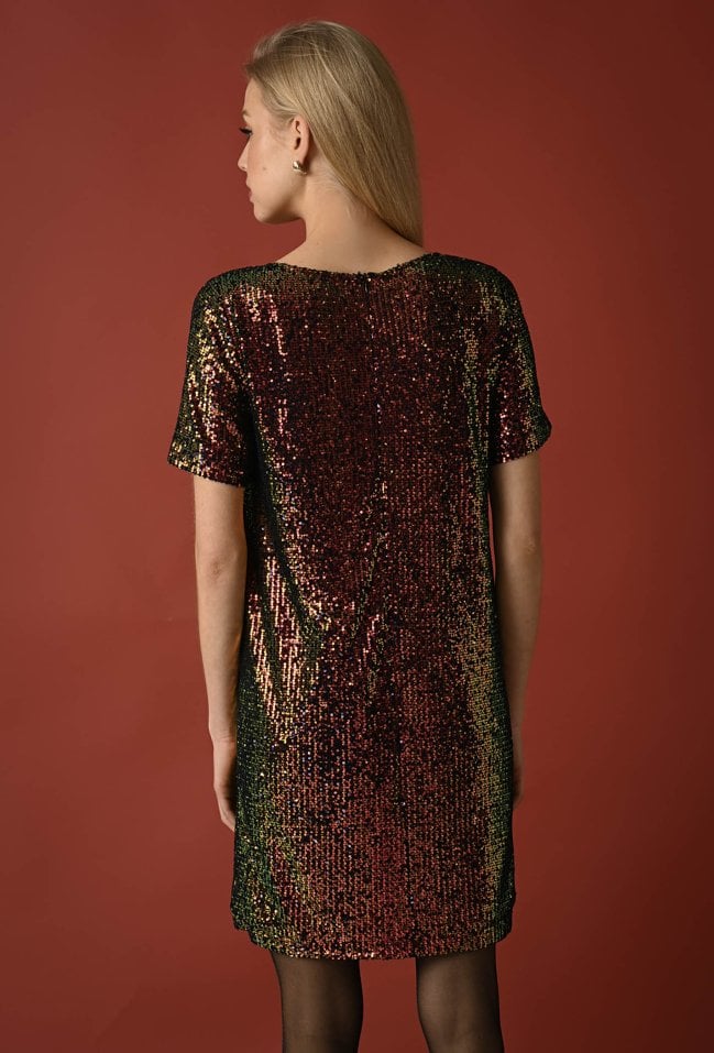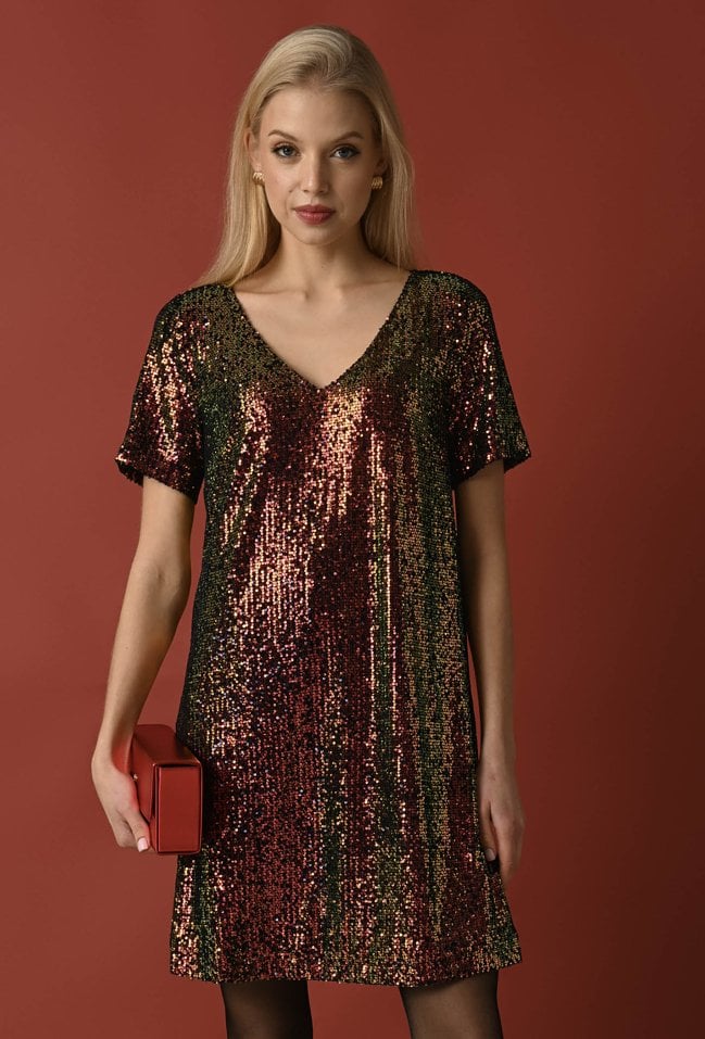 Cekinowa sukienka o eleganckim kroju z krótkim rękawem to doskonały wybór na wiele okazji. Jej prosty fason oraz zabudowany dekolt sprawiają, że pasuje na wszystkie rodzaje sylwetki. Wykonana z drobnych cekinów, które pięknie połyskują sprawi, że ciężko w niej przejść niezauważoną. Długość nad kolano sprawia, że jest idealna zarówno na dzienne, jak i wieczorowe wydarzenia. Ta sukienka stanie się niezastąpionym elementem Twojej garderoby. Modelka na zdjęciu ma 177 cm wzrostu i prezentuje rozmiar 36.