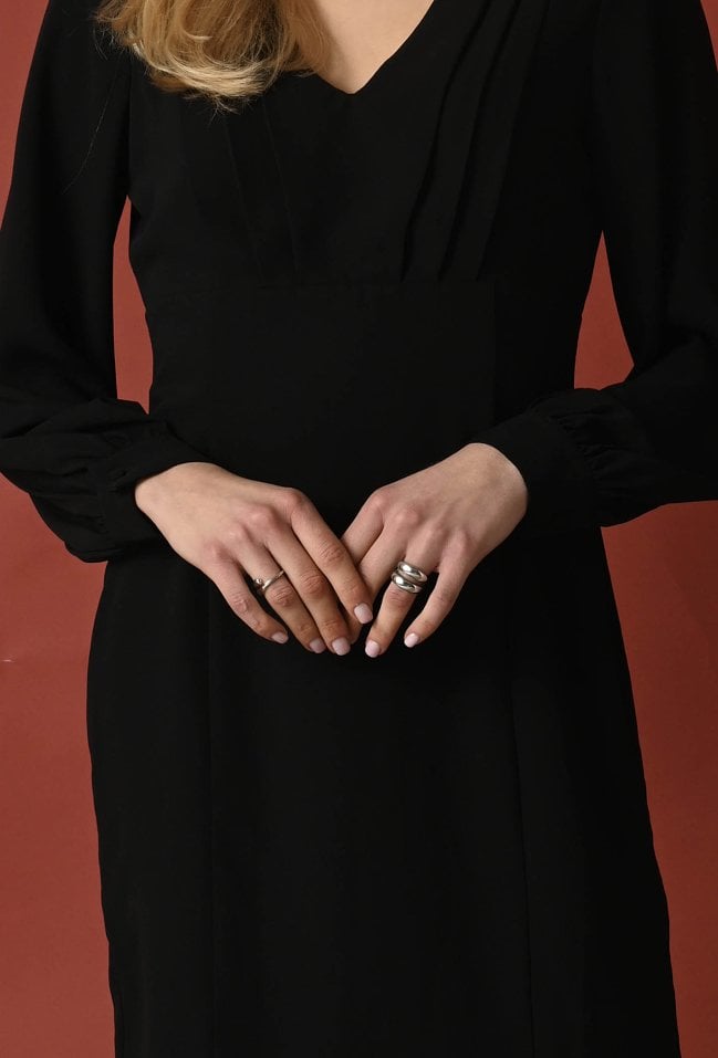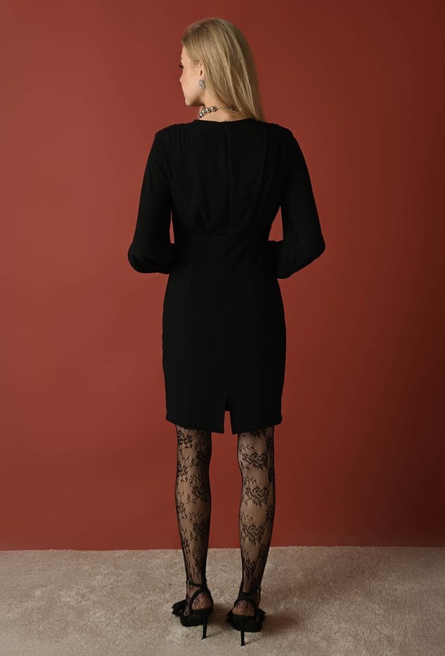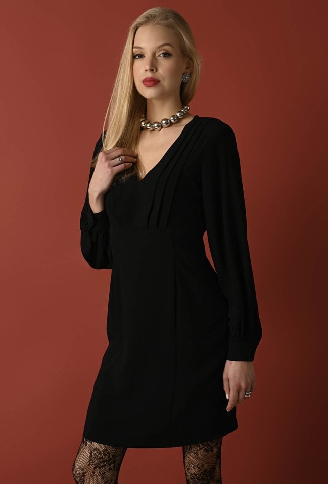 Kobieca sukienka w klasycznym czarnym kolorze. Posiada nowoczesny kroju z wycięciem pod biustem, które subtelnie podkreśla sylwetkę. Długie rękawy zakończone bufkami dodają całości delikatności i elegancji. Z tyłu sukienki znajduje się praktyczne rozcięcie oraz kryty zamek błyskawiczny, który gwarantuje wygodne zapinanie i gładkie wykończenie. Idealna propozycja na wieczorne wyjścia i specjalne okazje. Modelka ma 177 cm wzrostu i ma na sobie rozmiar 36.