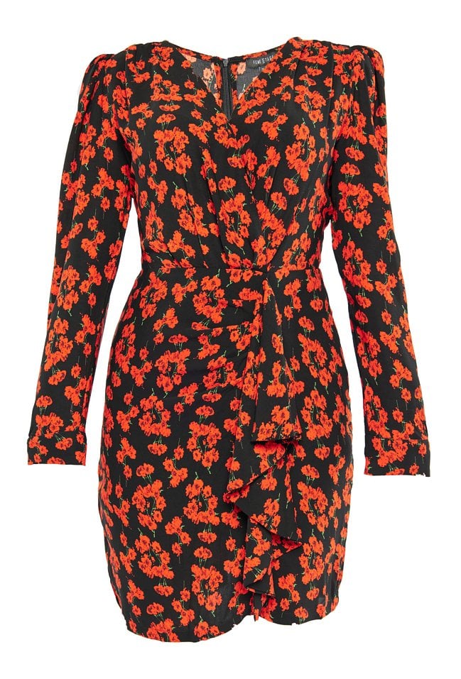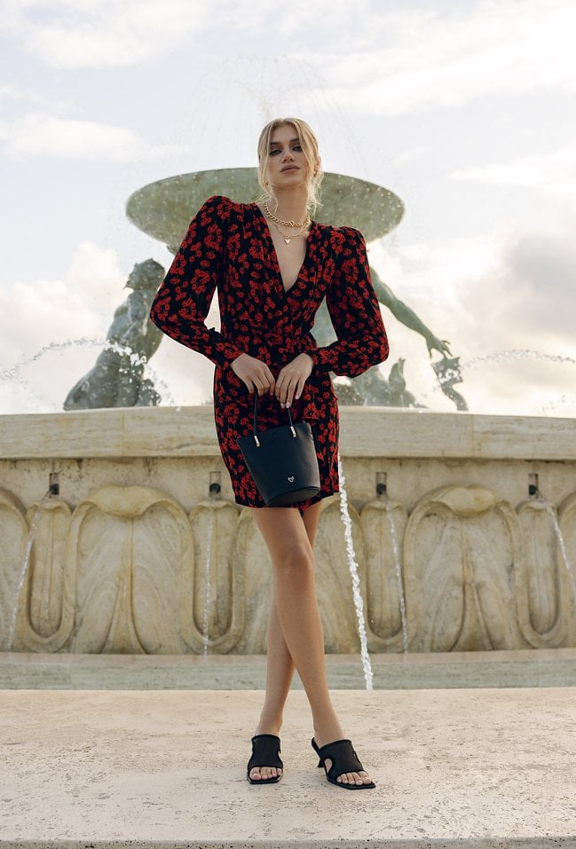 To doskonały wybór do wieczorowych damskich stylizacji ale nie tylko. Piękny print w czerwone kwiaty, głęboki dekolt oraz podsinione ramiona prezentuje się na sylwetce doskonale. Na dole sukienki znajduje się ozdobna falbana, która dodaje jej charakteru. To sukienka z efektem wow! Modelka na zdjęciu ma 175 cm wzrostu i prezentuje rozmiar 36/S.