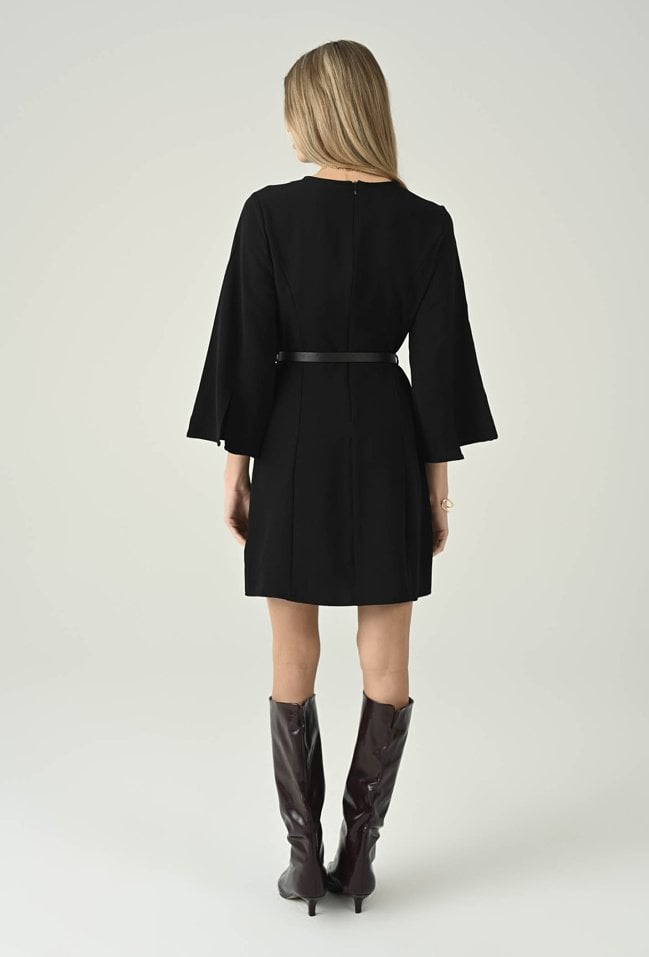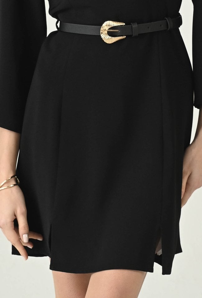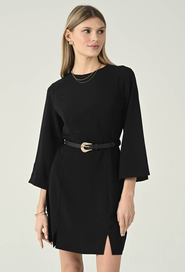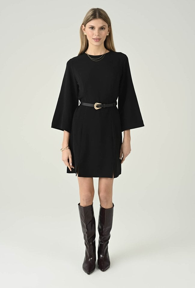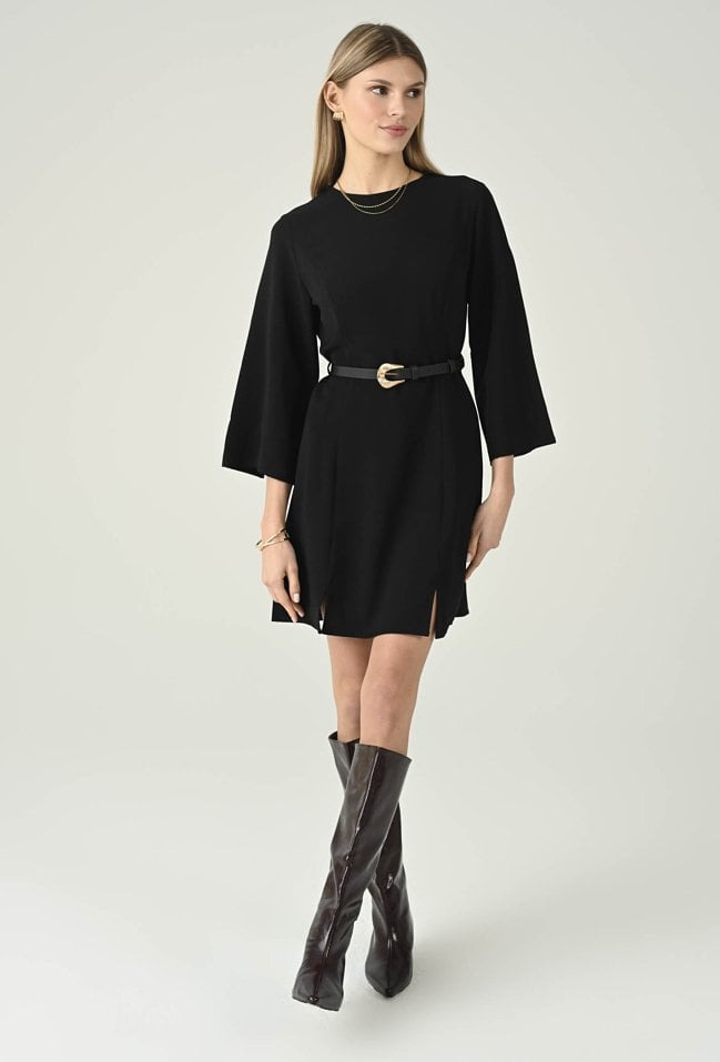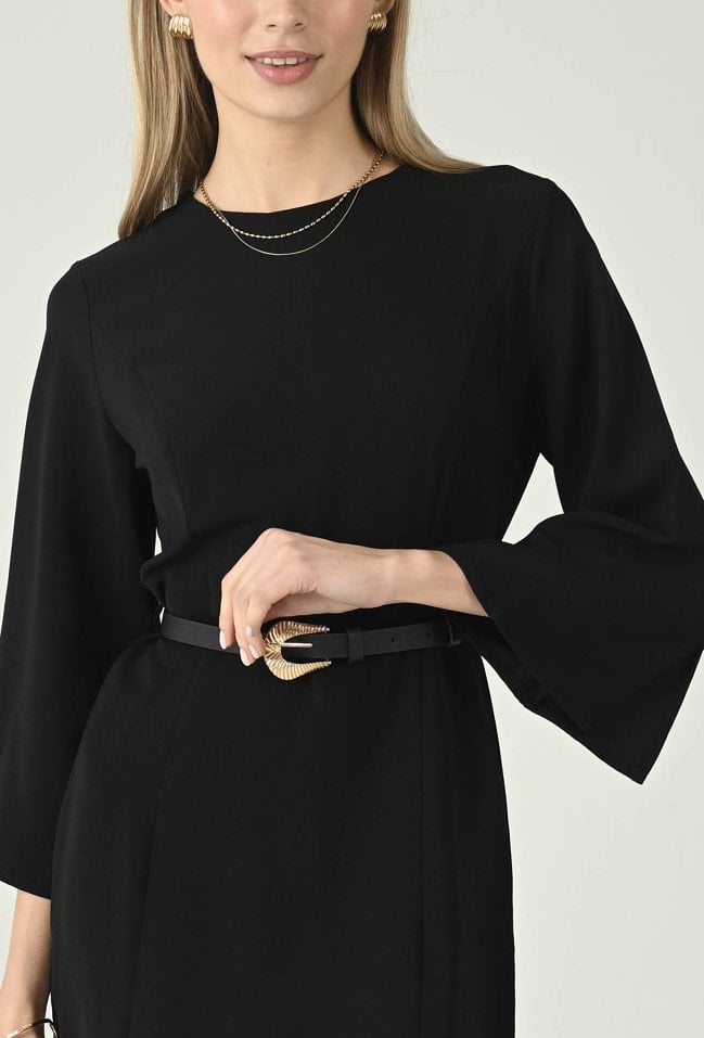 Ponadczasowa czarna sukienka, która łączy prostotę z eleganckim wykończeniem. Minimalistyczny fason świetnie układa się na sylwetce, a pasek w talii pozwala podkreślić proporcje i nadać stylizacji bardziej kobiecego charakteru. Rękawy 3/4 z delikatnie rozkloszowanym wykończeniem dodają lekkości i nowoczesnego akcentu, a rozcięcia u dołu zapewniają swobodę ruchów. To model, który sprawdzi się zarówno na co dzień, jak i na wieczorne wyjścia — wystarczy zmienić dodatki, aby uzyskać bardziej formalny efekt. Noś ją z kozakami, botkami lub szpilkami, tworząc dopracowany look.