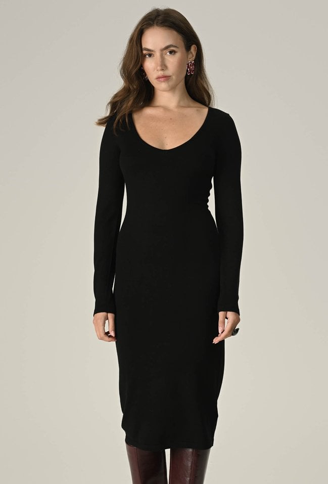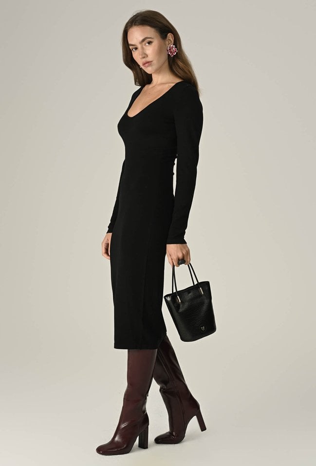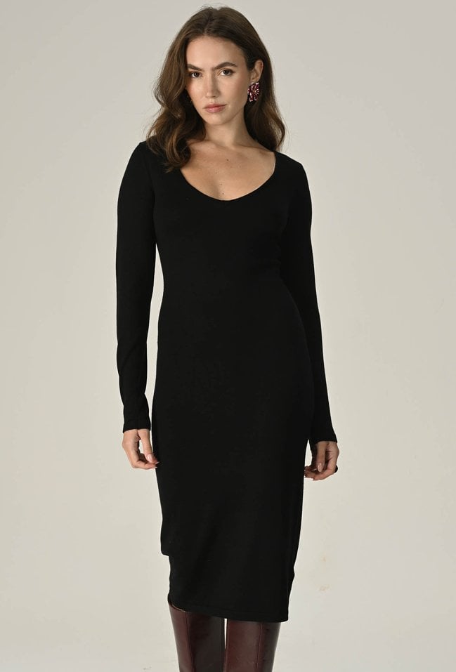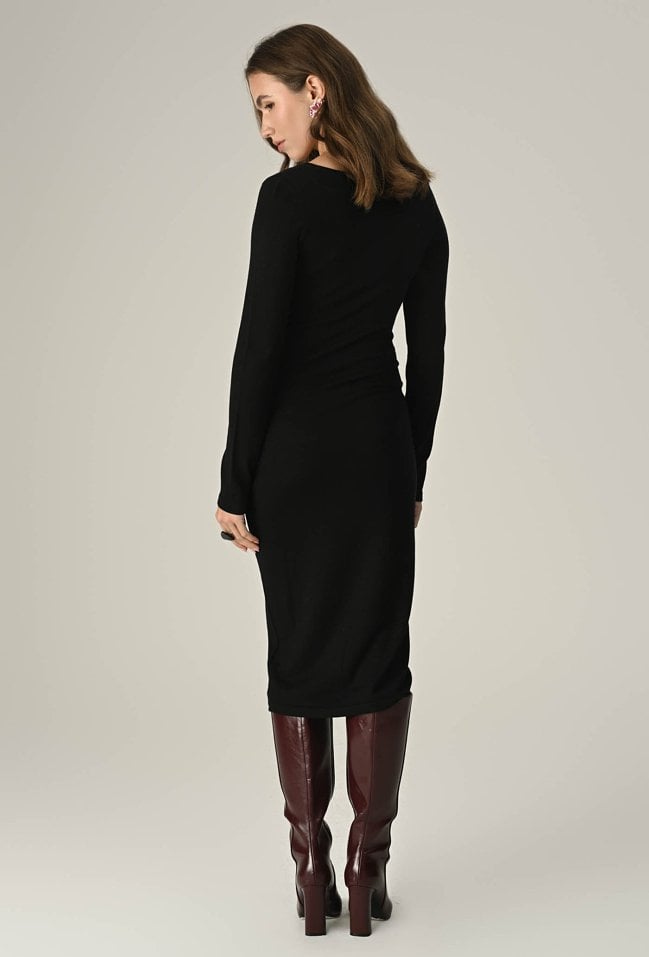 Elegancka i kobieca — ta długa sukienka dzianinowa z wiskozy to idealny wybór na każdą okazję. Wykonana z miękkiej, elastycznej dzianiny, doskonale dopasowuje się do sylwetki, podkreślając jej kształty. Długi rękaw i klasyczny krój sprawiają, że sukienka świetnie sprawdzi się zarówno na co dzień, jak i na wieczorne wyjścia. Modelka na zdjęciu ma 173 cm wzrostu i prezentuje rozmiar 36/S.
