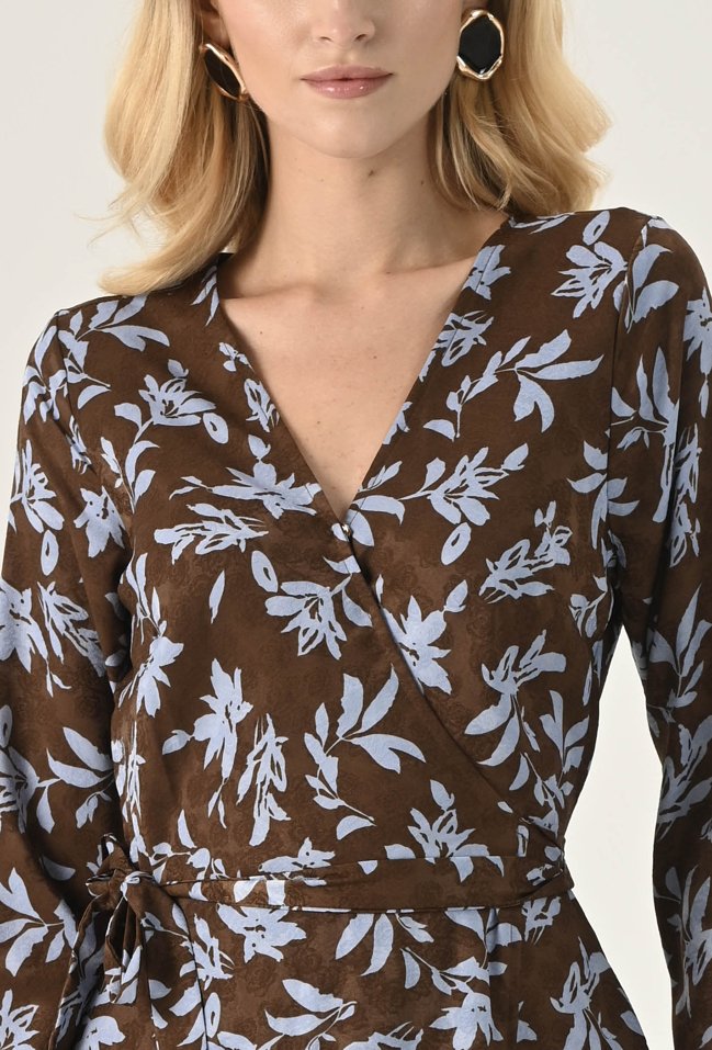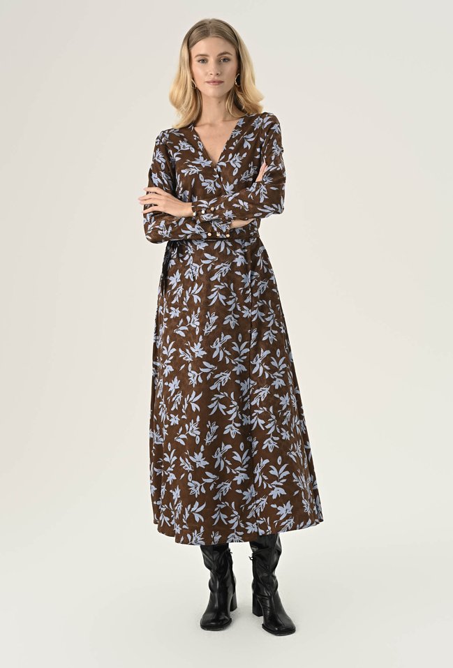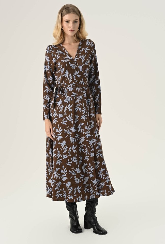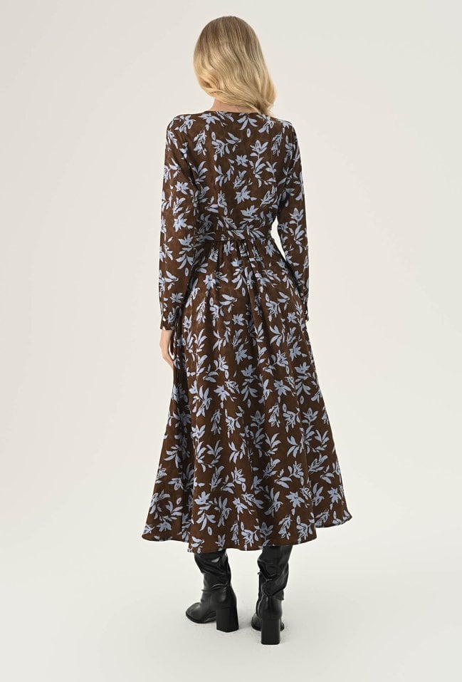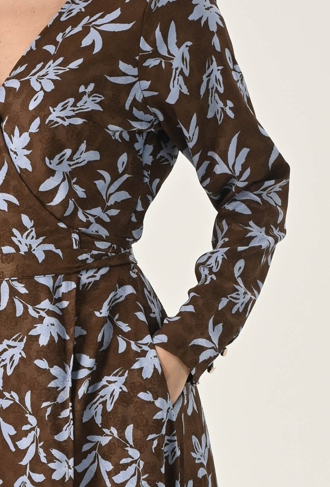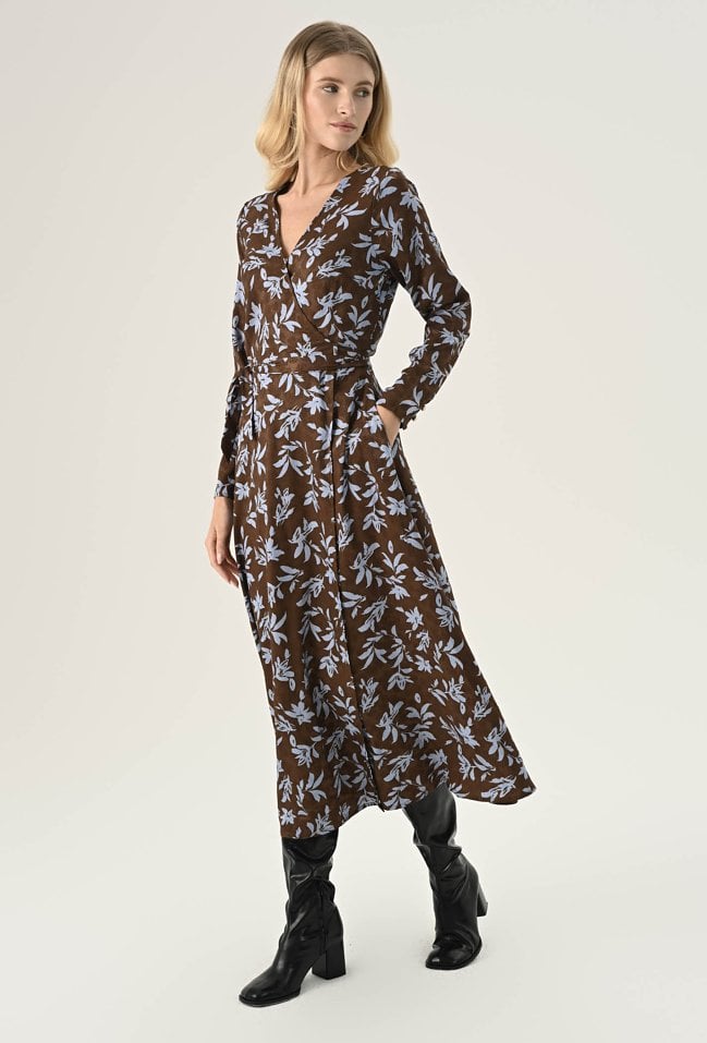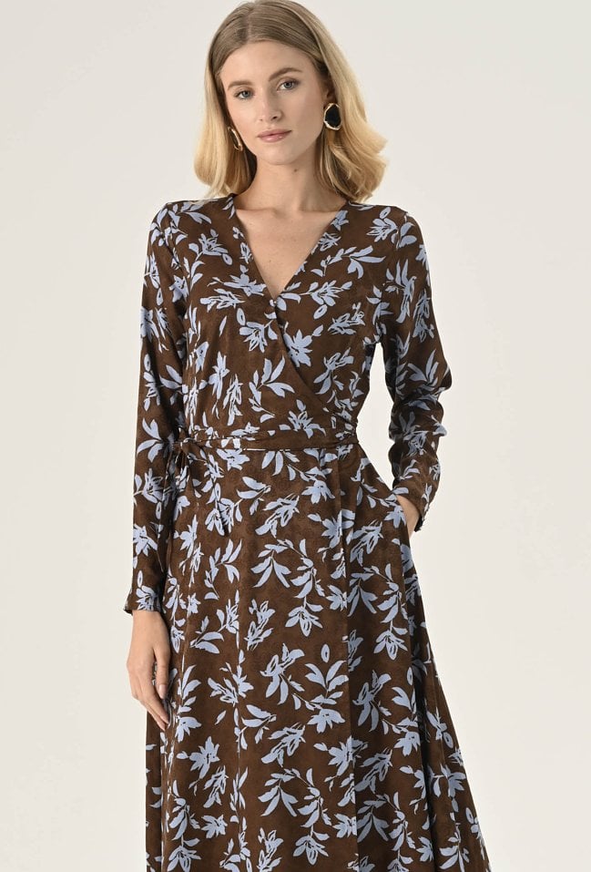 Długa sukienka o eleganckim, a zarazem swobodnym kroju. Kopertowy dekolt wysmukla szyję, a długie rękawy dodają klasy. Wzór w kwiaty nadaje całości romantycznego charakteru. Sukienka posiada praktyczne kieszenie po bokach, które łączą styl z wygodą. Idealna na rodzinne uroczystości, przyjęcia lub codzienne wyjścia jesienią. Modelka na zdjęciu ma 174 cm wzrostu i nosi rozmiar 36.