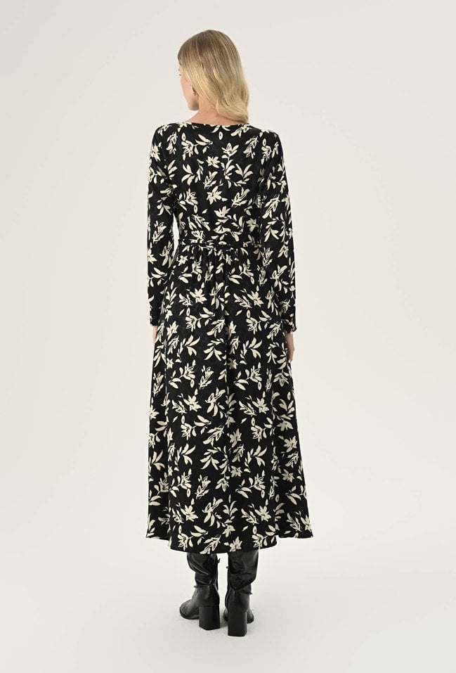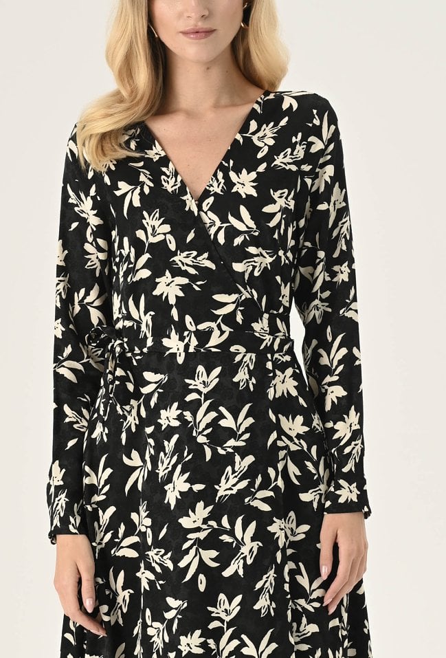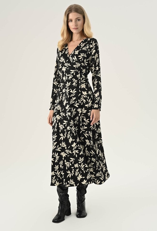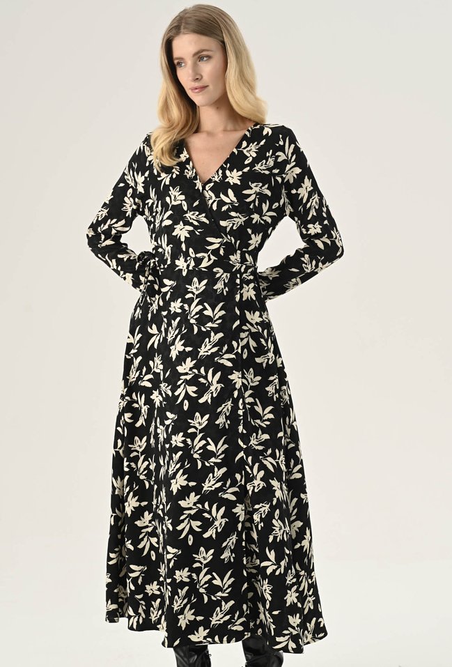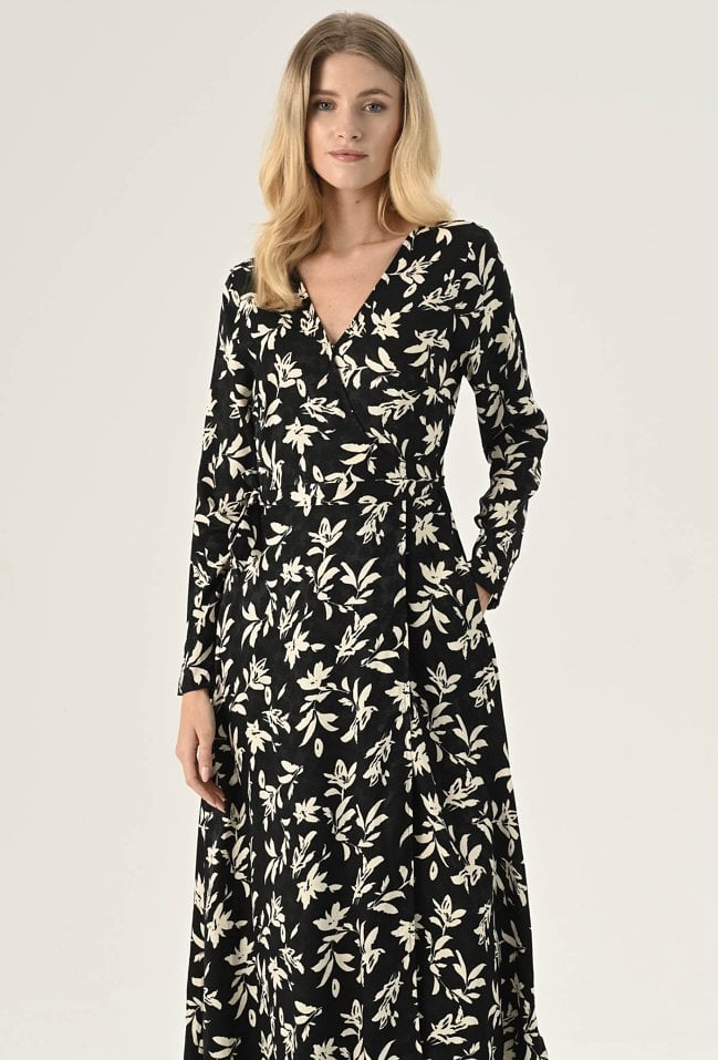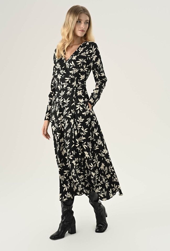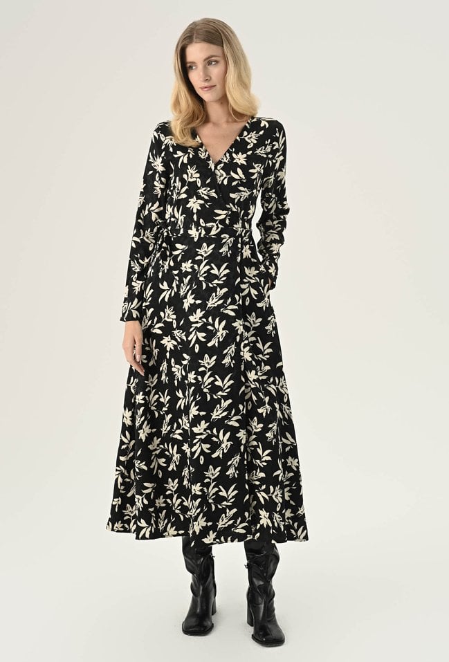 Długa sukienka o eleganckim, a zarazem swobodnym kroju. Kopertowy dekolt wysmukla szyję, a długie rękawy dodają klasy. Wzór w kwiaty nadaje całości romantycznego charakteru. Sukienka posiada praktyczne kieszenie po bokach, które łączą styl z wygodą. Idealna na rodzinne uroczystości, przyjęcia lub codzienne wyjścia jesienią. Modelka na zdjęciu ma 174 cm wzrostu i nosi rozmiar 36.