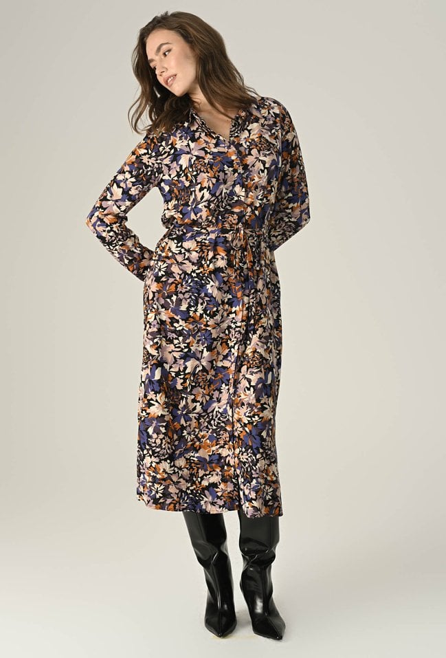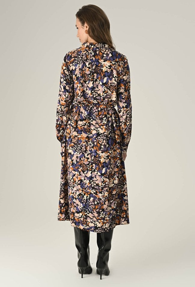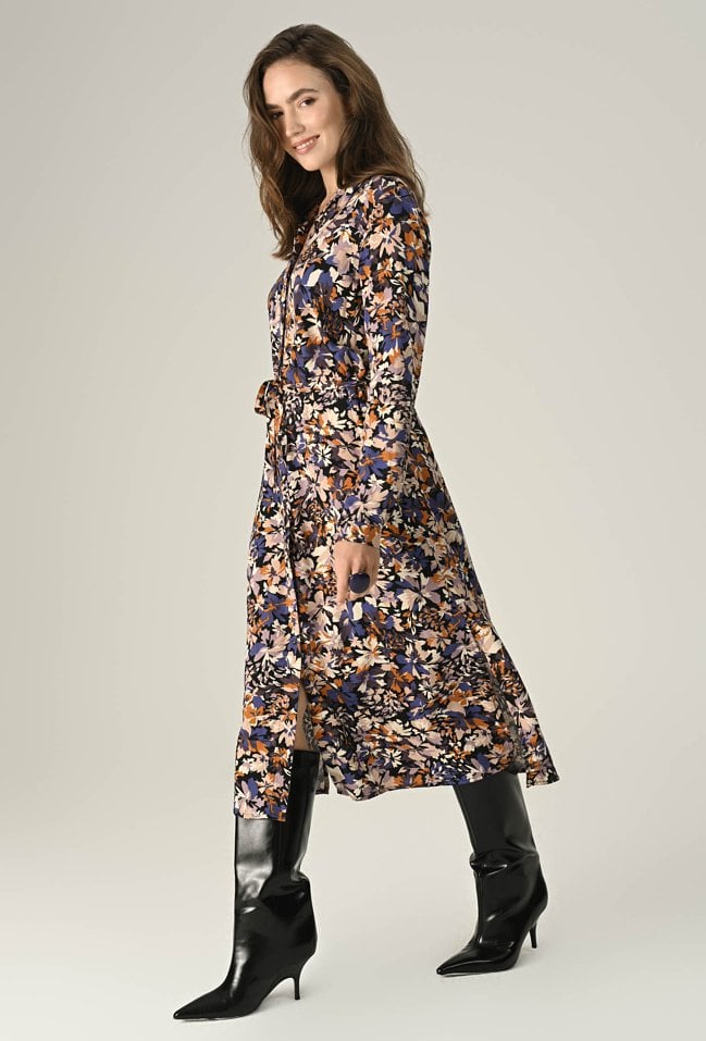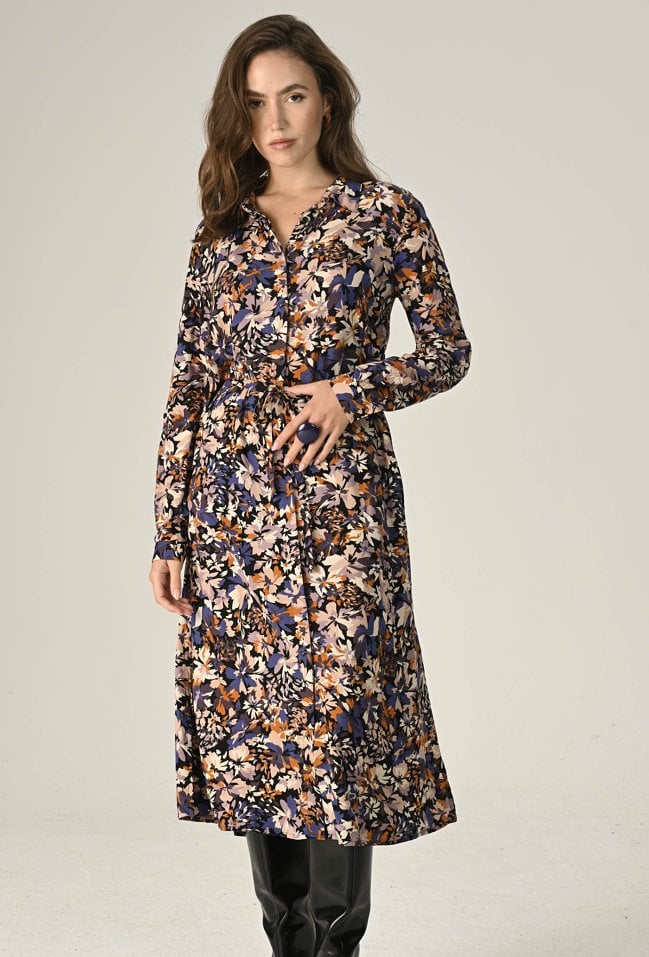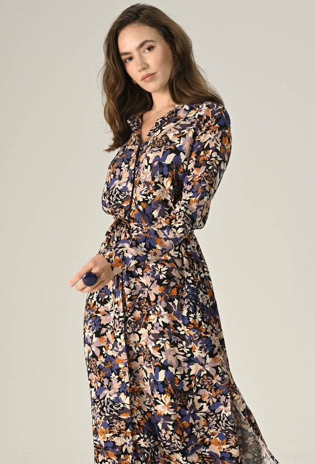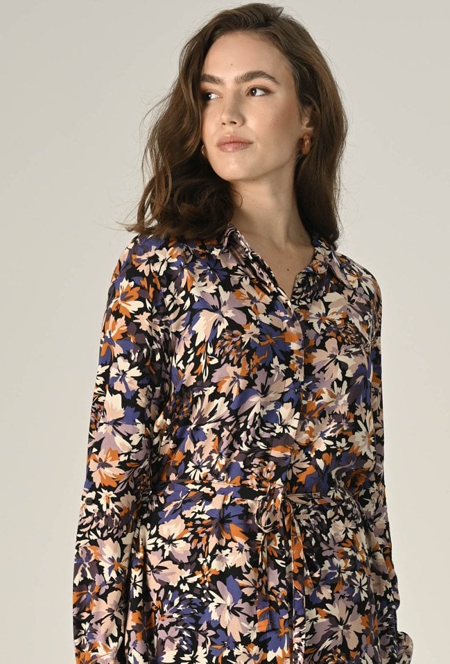 Stylowa, długa szmizjerka uszyta ze 100% wiskozy to idealne połączenie wygody i elegancji. Klasyczny kołnierzyk i długi rękaw z reglanowym cięciem, który można podwinąć, nadają jej uniwersalnego charakteru. Talia podkreślona materiałowym paskiem pięknie modeluje sylwetkę, a lekka, oddychająca tkanina zapewnia komfort przez cały dzień. Świetna na co dzień, do pracy i na spotkania. Modelka na zdjęciu ma 174 cm wzrostu i prezentuje rozmiar 36.
