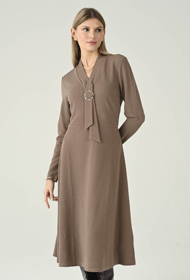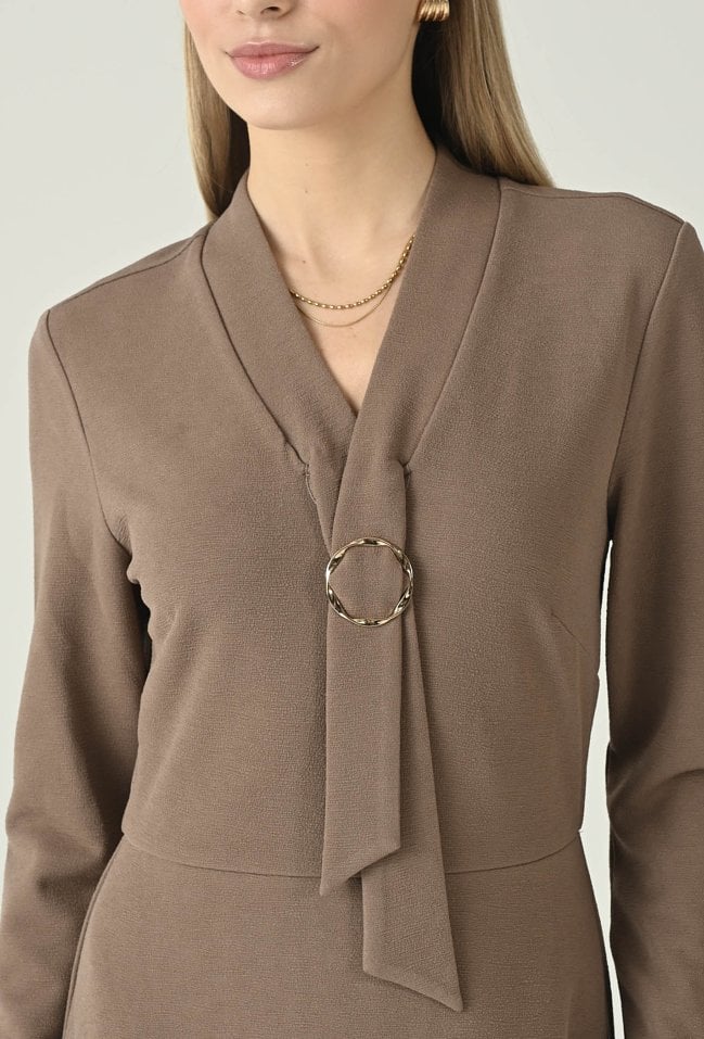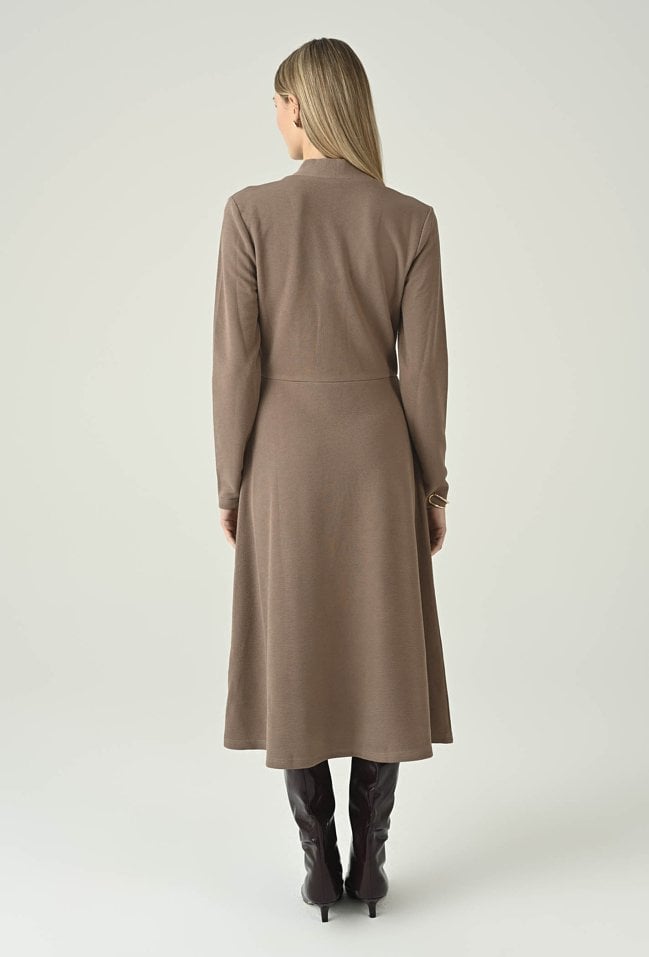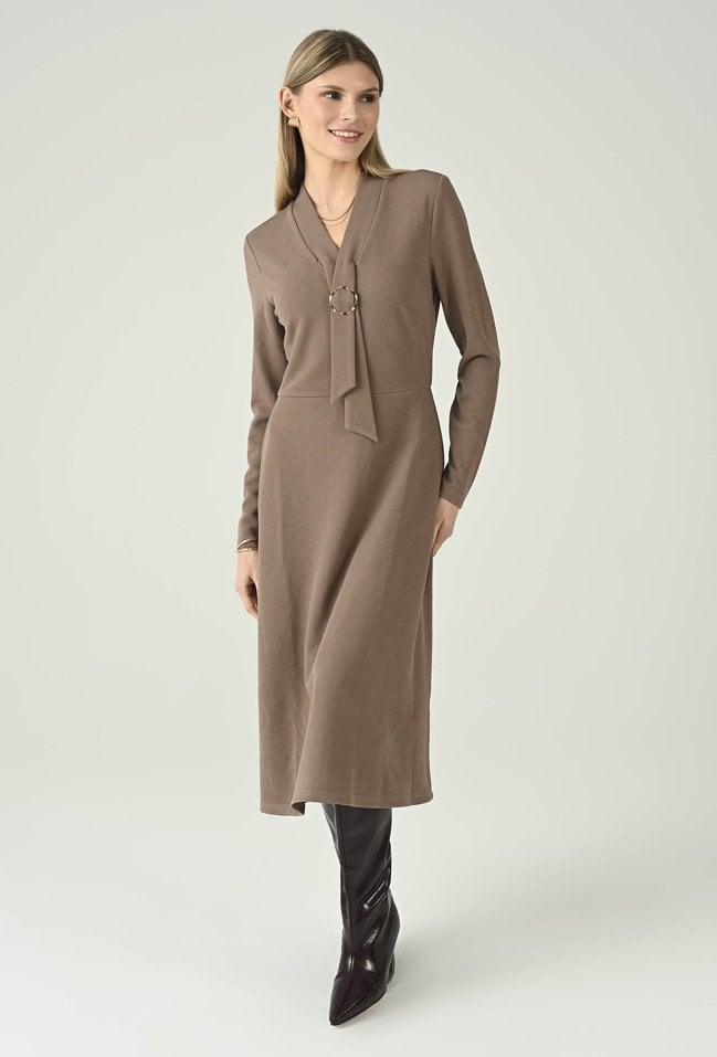 Stylowa dzianinowa sukienka o długości midi, która łączy komfort z kobiecą elegancją. Miękka, elastyczna dzianina pięknie dopasowuje się do sylwetki, a długi rękaw sprawia, że model idealnie sprawdzi się także w chłodniejsze dni. Dekolt w kształcie litery V z ozdobną klamrą przyciąga uwagę i nadaje całości wyjątkowego charakteru. To uniwersalna propozycja, która doskonale wygląda zarówno z botkami, jak i eleganckimi dodatkami. Modelka na zdjęciu ma 177 cm wzrostu i prezentuje rozmiar 36.