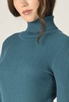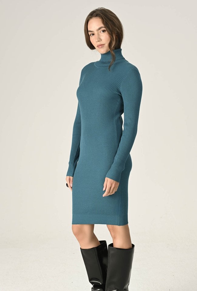 Stylowa i wygodna sukienka z miękkiej dzianiny z przewagą wiskozy. Lekki rib, długi rękaw i golf nadają jej elegancki, a zarazem swobodny charakter. Turkusowy kolor ożywi Twoje stylizacje i podkreśli urodę. Idealna na chłodniejsze dni – na co dzień i na wyjątkowe okazje. Modelka na zdjęciu ma 174 cm wzrostu i prezentuje rozmiar 36.
