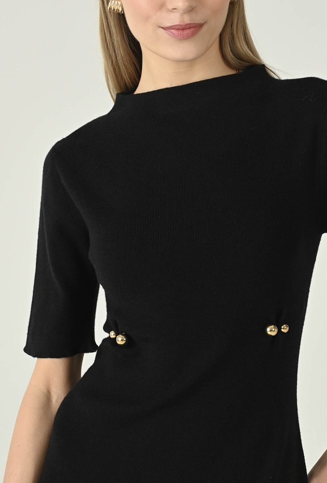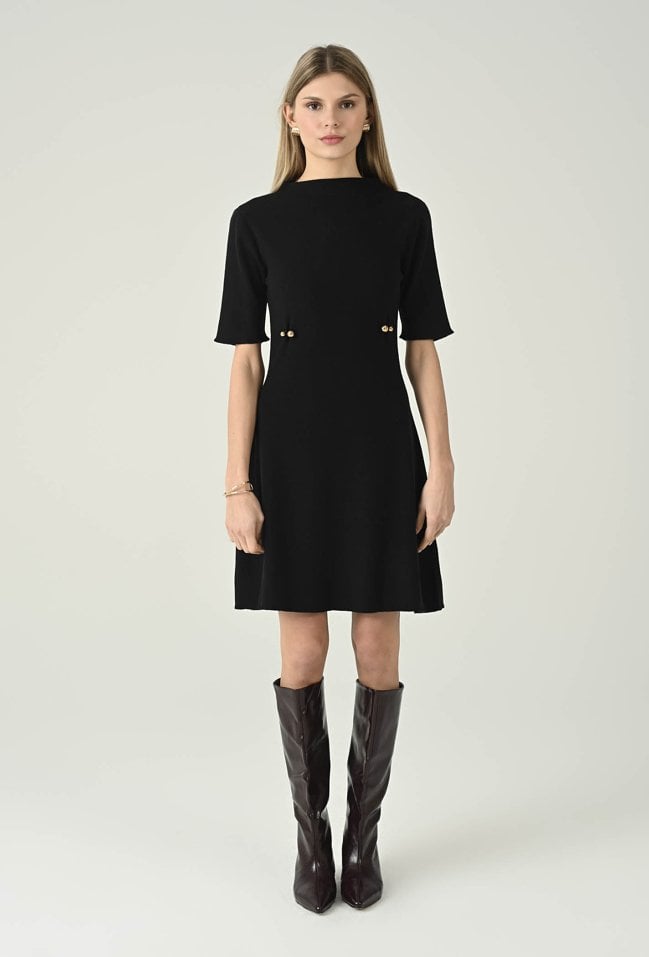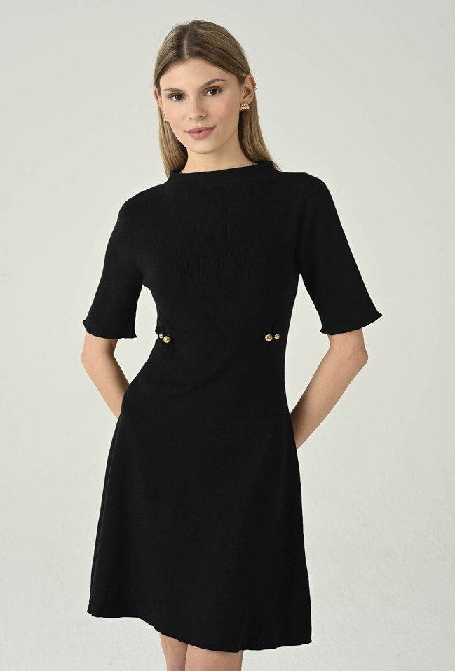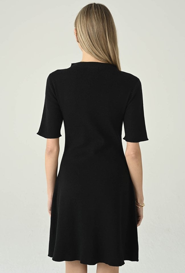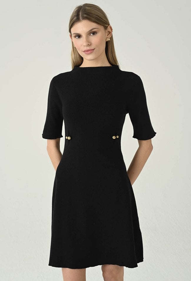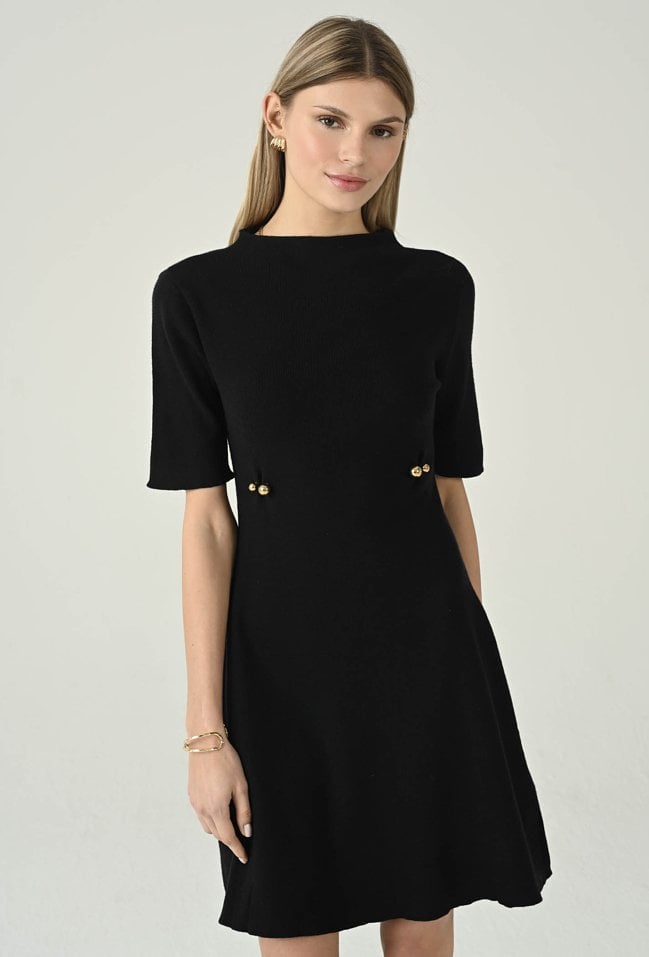 Elegancka krótka dzianinowa sukienka z dodatkiem wiskozy, która łączy wygodę z kobiecym stylem. Lekka stójka i rękawy do łokcia nadają całości subtelnej lekkości, a ozdobne detale na przodzie przyciągają wzrok i dodają charakteru. Idealna propozycja na co dzień i na wyjątkowe okazje, gdy chcesz wyglądać stylowo i komfortowo. Modelka na zdjęciu ma 177 cm wzrostu i prezentuje rozmiar 36.