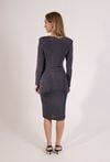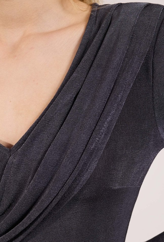 Elegancka sukienka damska o długości midi z długim rękawem. Model z dekoltem w kształcie litery V oraz efektownymi marszczeniami, które podkreślają sylwetkę i nadają stylizacji wyjątkowego charakteru. Sukienka doskonale sprawdzi się na przyjęcia, spotkania oraz inne uroczystości. Modelka na zdjęciach ma 177 cm wzrostu i prezentuje rozmiar 36.