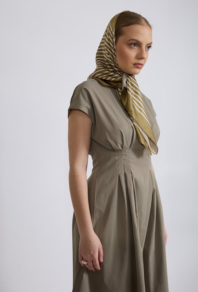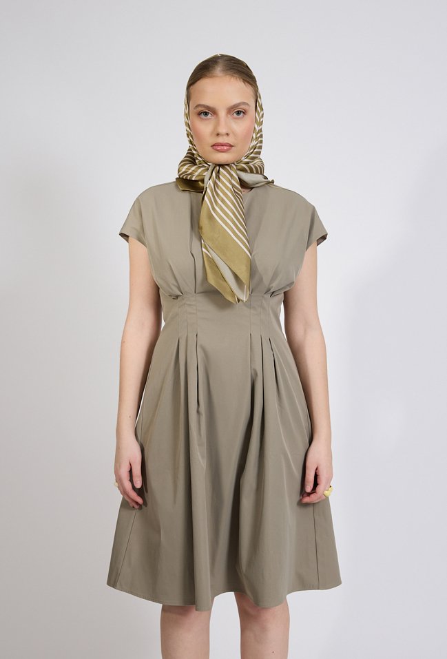 Sukienka damska o eleganckim, kobiecym kroju. Model o długości midi z krótkim, lekko opadającym rękawem oraz klasycznym, zaokrąglonym dekoltem. W talii zastosowano efektowne przeszycia i zakładki, które podkreślają sylwetkę oraz nadają sukience wyjątkowego charakteru. Rozkloszowany dół pięknie układa się w ruchu, zapewniając komfort noszenia. Modelka na zdjęciu ma 177 cm wzrostu i prezentuje rozmiar S.