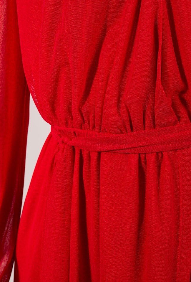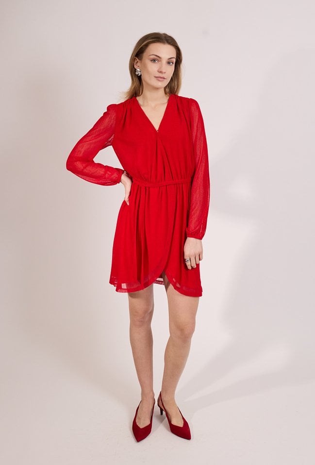 Elegancka sukienka damska mini z długim rękawem. Model z kopertowym dekoltem w kształcie litery V oraz wiązaniem w pasie, które podkreśla sylwetkę. Sukienka doskonale sprawdzi się na przyjęcia, spotkania oraz inne uroczystości. Modelka na zdjęciu ma 177 cm wzrostu i prezentuje rozmiar 36.