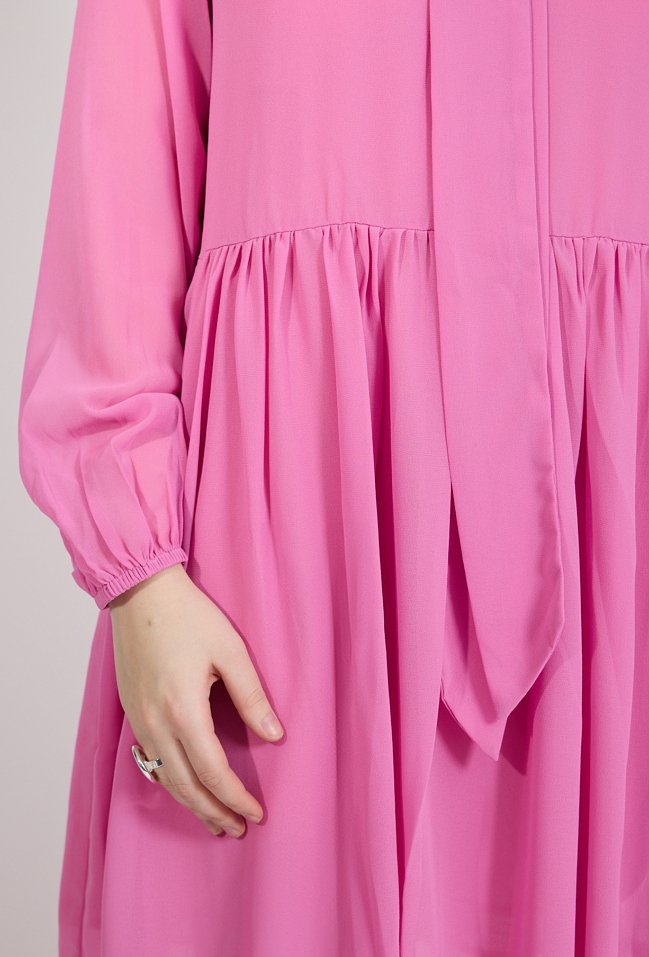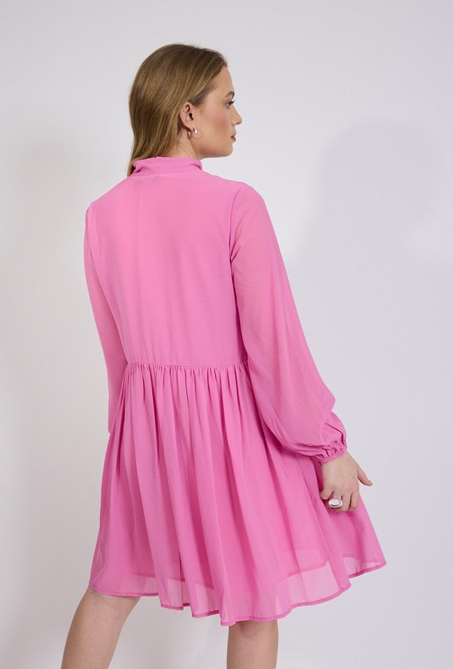 Sukienka damska o lekkim, rozkloszowanym kroju. Model o długości przed kolano z długim rękawem zakończonym elastycznym mankietem oraz stójką z dekoracyjnym wiązaniem przy dekolcie. Damska sukienka doskonale sprawdzi się w stylizacjach codziennych oraz na wyjątkowe okazje. Modelka na zdjęciu ma 177 cm wzrostu i prezentuje rozmiar 36.