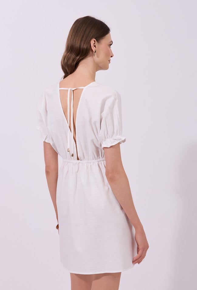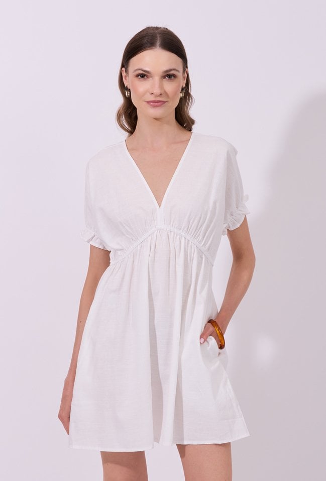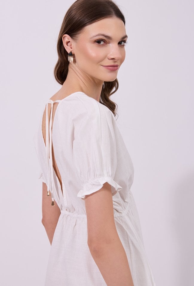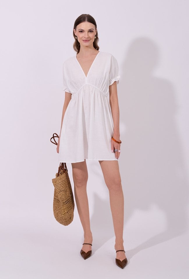 Sukienka damska o luźnym, rozkloszowanym kroju mini z krótkim rękawem. Model z dekoltem w kształcie litery V oraz odcięciem pod biustem, które nadaje całości lekkości i podkreśla sylwetkę. Sukienka idealnie sprawdzi się w codziennych, letnich stylizacjach. Modelka na zdjęciu ma 177 cm wzrostu i prezentuje rozmiar S.