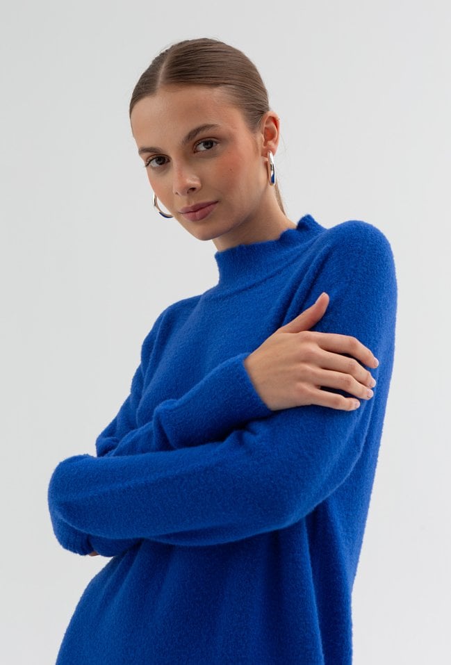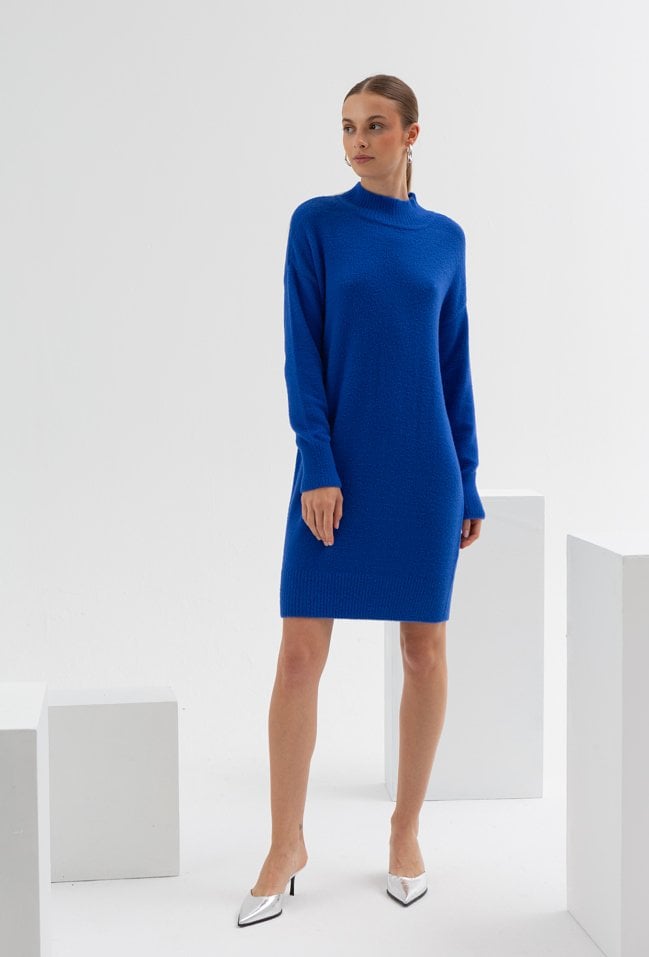 Kobaltowa sukienka z półgolfem wykonana z miękkiej i przyjemnej w dotyku dzianiny z dodatkiem wiskozy . Ma dopasowany fason z półgolfem. Długość przed kolna prezentuje się kobieco. Sukienka ma długie rękawy. Bedzie doskonałą propozycją na chłodne jesienne dni. Noś ją z kozakami lub szpilkami. Modelka na zdjęciu ma 178 cm wzrostu i prezentuje rozmiar 36.