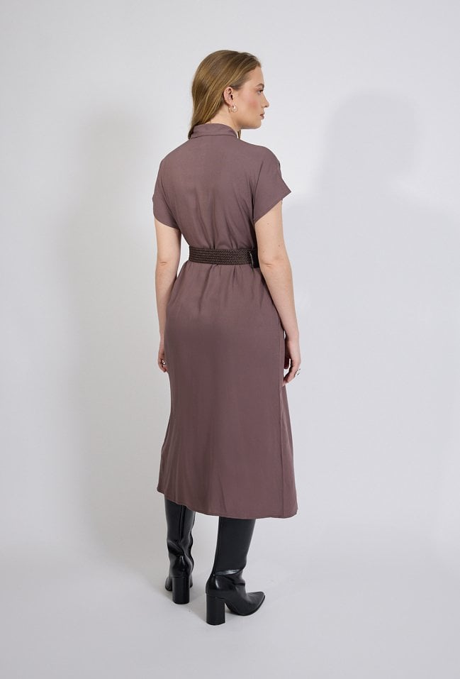 Sukienka damska o klasycznym, koszulowym kroju. Model o długości midi z krótkim rękawem oraz kołnierzykiem, zapinany na guziki na całej długości. Prosta forma i staranne wykończenie nadają całości eleganckiego, ponadczasowego charakteru. Koszulowa sukienka damska doskonale sprawdzi się w codziennych oraz bardziej stylowych stylizacjach. Pasek widoczny na zdjęciu nie stanowi elementu sukienki. Modelka na zdjęciu ma 177 cm wzrostu i prezentuje rozmiar S.