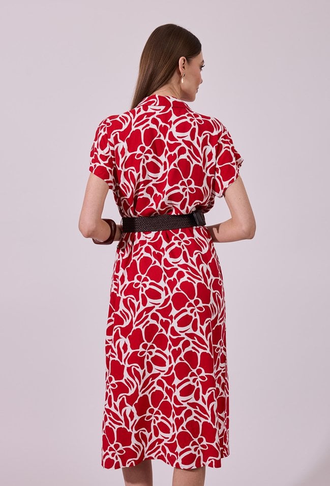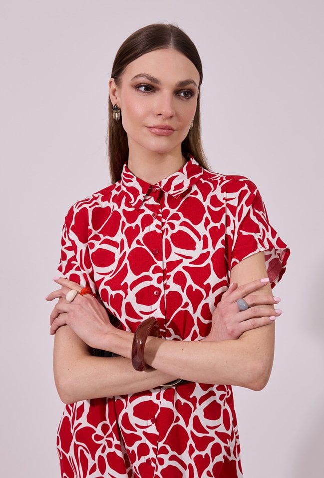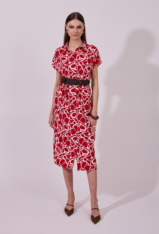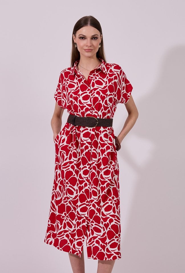 Sukienka damska o klasycznym, koszulowym kroju. Model o długości midi z krótkim rękawem oraz kołnierzykiem, zapinany na guziki na całej długości. Prosta forma i staranne wykończenie nadają całości eleganckiego, ponadczasowego charakteru. Koszulowa sukienka damska doskonale sprawdzi się w codziennych oraz bardziej stylowych stylizacjach. Pasek widoczny na zdjęciu nie stanowi elementu sukienki. Modelka na zdjęciu ma 177 cm wzrostu i prezentuje rozmiar S.