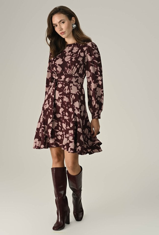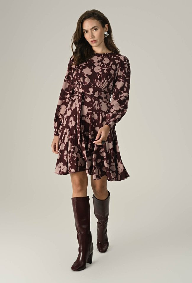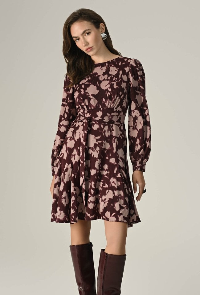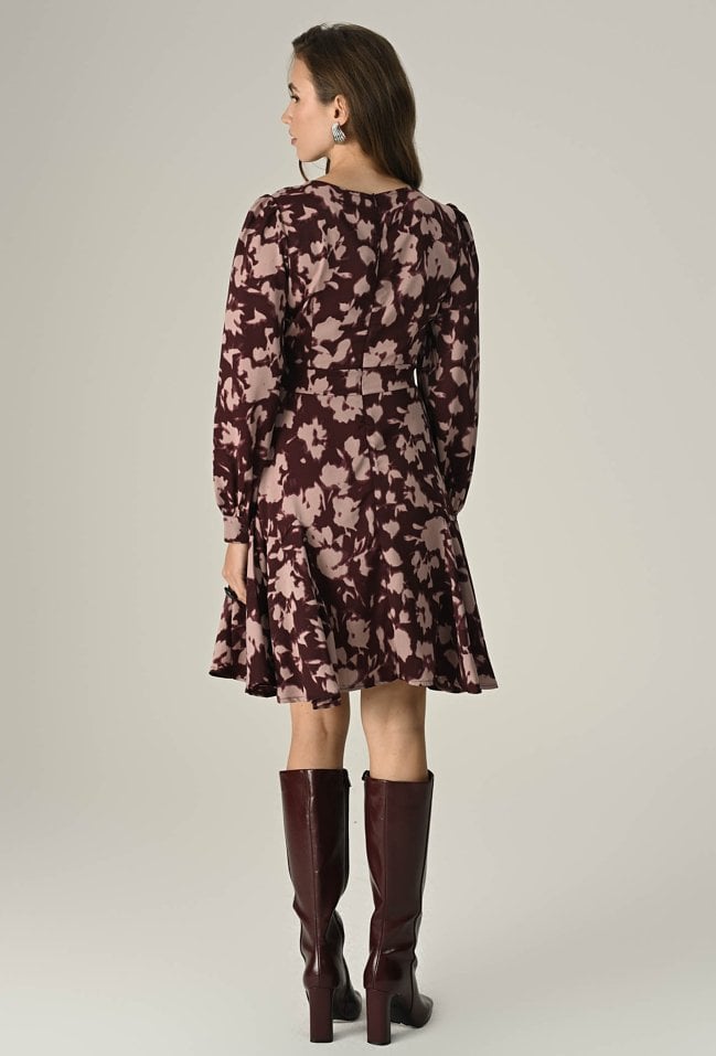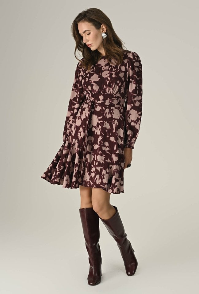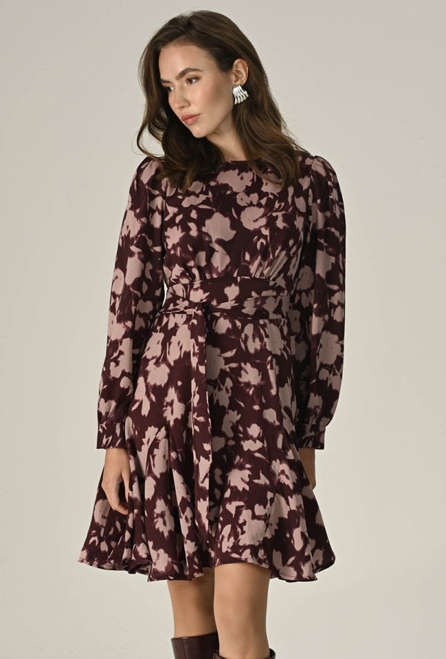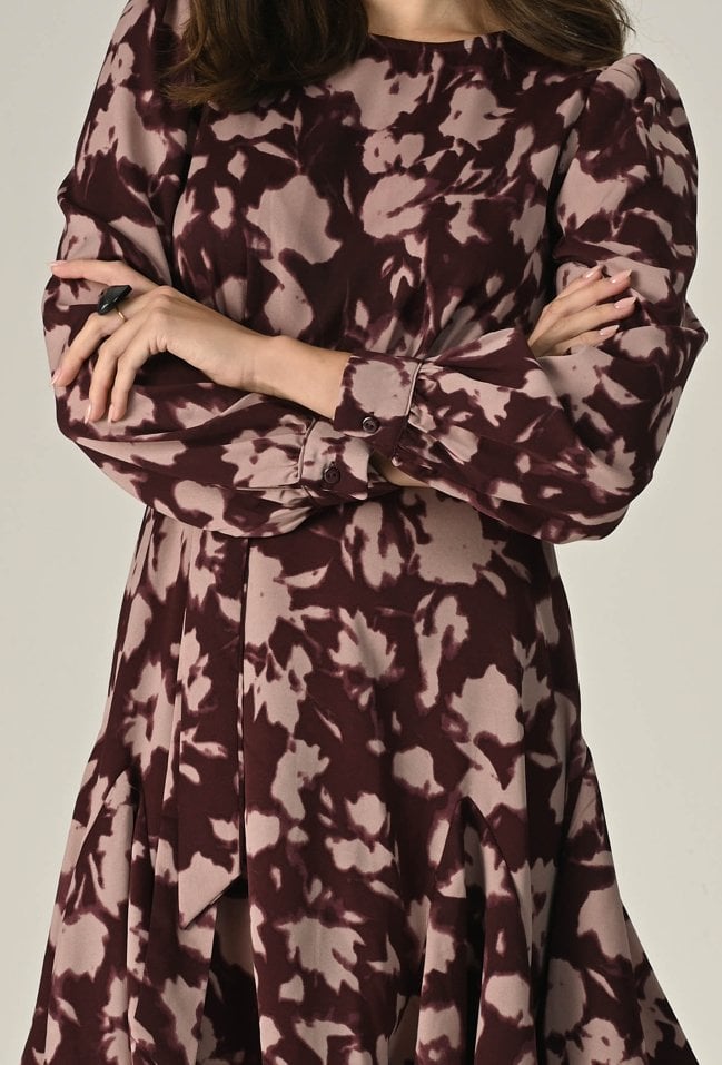 Sukienka wykonana z przyjemnego w dotyku materiału w oryginalnym princie. Długie rękawy zakończone mankietami i praktyczny zamek z tyłu sprawiają, że jest to idealny wybór na eleganckie, ale wygodne stylizacje na co dzień. Modelka na zdjęciu ma 173 cm wzrostu i prezentuje rozmiar 36.