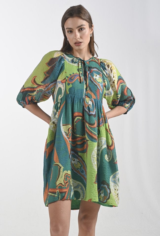 Krótka, kolorowa sukienka w stylu funky to idealny wybór dla odważnych i pewnych siebie kobiet. Delikatny dekolt z ozdobnym wiązaniem dodaje uroku, a krótkie bufiaste rękawy wprowadzają modny, dziewczęcy akcent. Energetyczny print przyciąga spojrzenia i sprawia, że każda stylizacja nabiera charakteru. Postaw na luz, styl i oryginalność – ta sukienka zrobi wrażenie! Modelka na zdjęciu ma 177 cm wzrostu i prezentuje rozmiar 36/S.