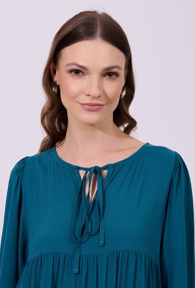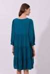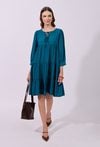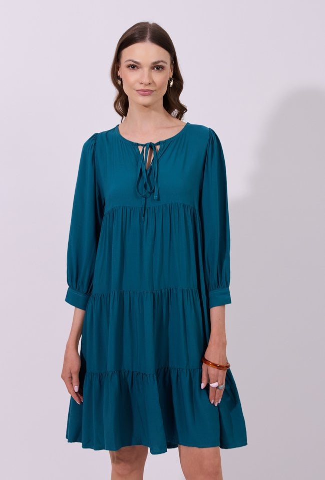 Urokliwa sukienka z lekkiej wiskozy to doskonały wybór dla miłośniczek kobiecych fasonów i romantycznych detali. Bufiaste rękawy 3/4 zakończone mankietem nadają sylwetce lekkości, a falbany dodają sukience zwiewności i subtelnego ruchu. Półokrągły dekolt z delikatnym wiązaniem podkreśla szyję i nadaje całości wyjątkowego charakteru. Idealna na spotkania, spacery i letnie okazje. Modelka na zdjęciu ma 174 cm wzrostu i prezentuje rozmiar 36.