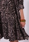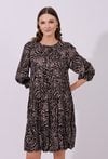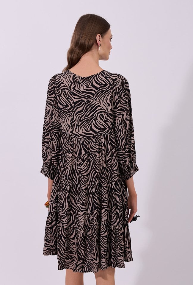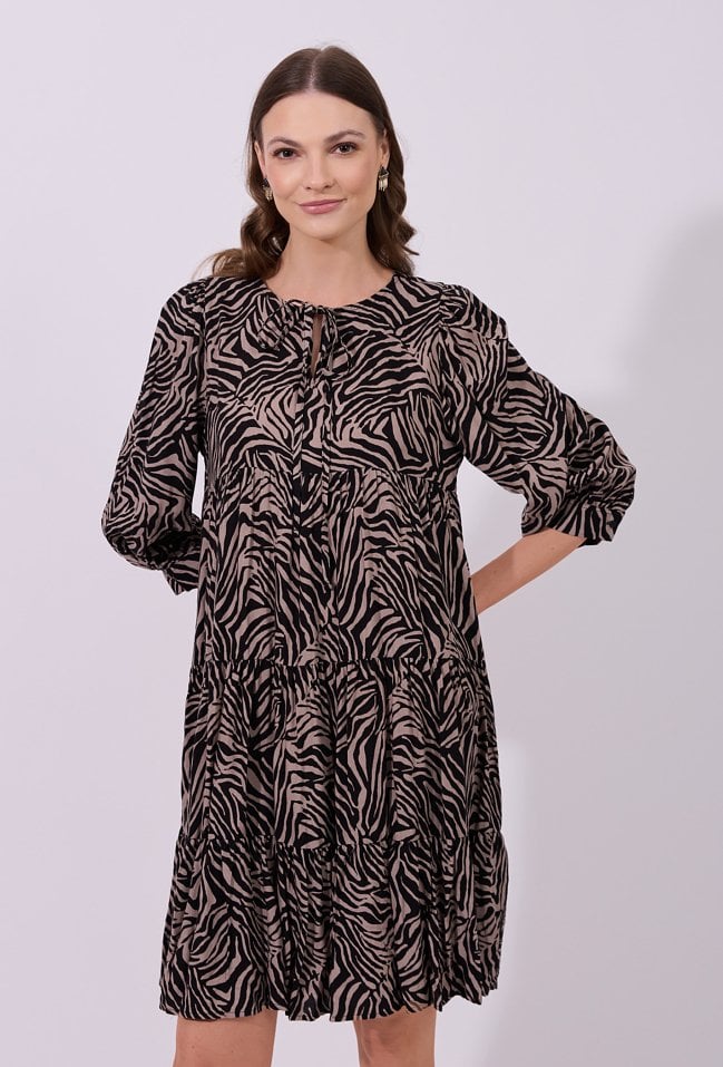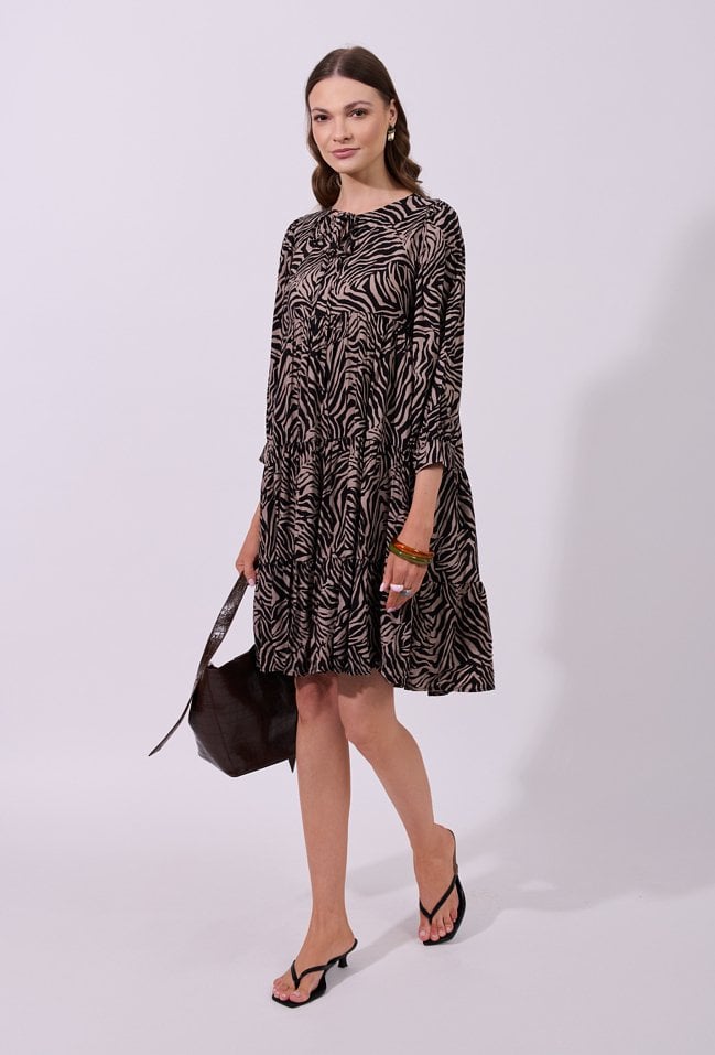Urokliwa sukienka z lekkiej wiskozy to doskonały wybór dla miłośniczek kobiecych fasonów i romantycznych detali. Bufiaste rękawy 3/4 zakończone mankietem nadają sylwetce lekkości, a falbany dodają sukience zwiewności i subtelnego ruchu. Półokrągły dekolt z delikatnym wiązaniem podkreśla szyję i nadaje całości wyjątkowego charakteru. Idealna na spotkania, spacery i letnie okazje. Modelka na zdjęciu ma 174 cm wzrostu i prezentuje rozmiar 36.