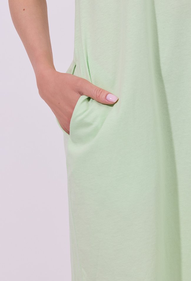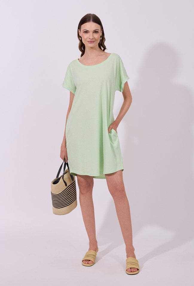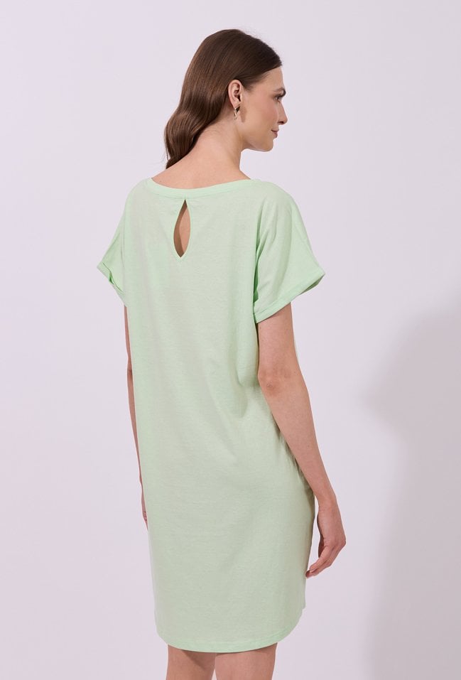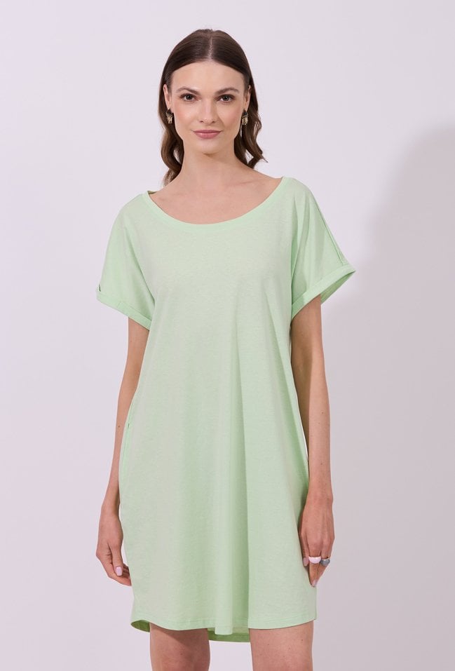 Sukienka damska o luźnym, swobodnym kroju mini z krótkim rękawem. Model z klasycznym, okrągłym dekoltem oraz podwiniętymi rękawami, które nadają całości casualowego charakteru. Minimalistyczny fason sprawia, że sukienka doskonale sprawdzi się w codziennych stylizacjach, gwarantując wygodę i ponadczasowy wygląd.