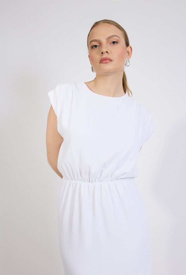 Sukienka damska o długości maxi w minimalistycznym, eleganckim stylu. Model z krótkim, lekko opadającym rękawem oraz klasycznym, zaokrąglonym dekoltem. W talii zastosowano elastyczne marszczenie, które subtelnie podkreśla sylwetkę i zapewnia komfort noszenia. Damska sukienka doskonale sprawdzi się zarówno na co dzień, jak i na bardziej eleganckie okazje. Modelka na zdjęciu ma 177 cm wzrostu i prezentuje rozmiar S.