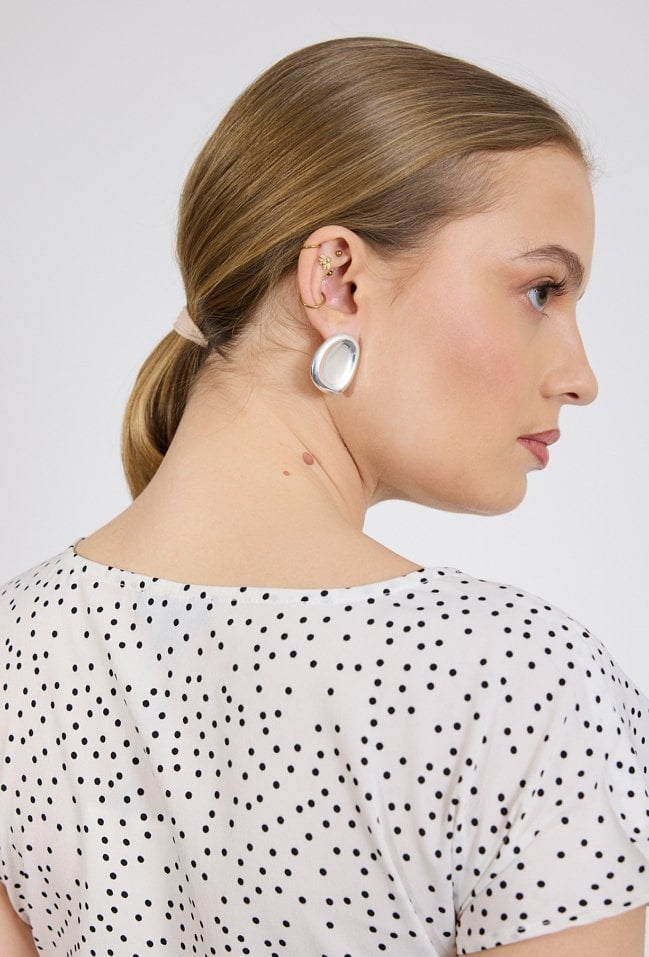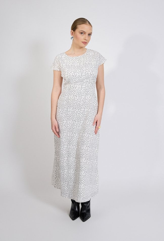 Sukienka damska o długości maxi z delikatnym, rozszerzanym dołem. Model z krótkim rękawem oraz klasycznym, zaokrąglonym dekoltem. Całość zdobi subtelny wzór w drobne kropki, który nadaje stylizacji lekkości i ponadczasowego charakteru. Modelka na zdjęciu ma 177 cm wzrostu i prezentuje rozmiar 36.