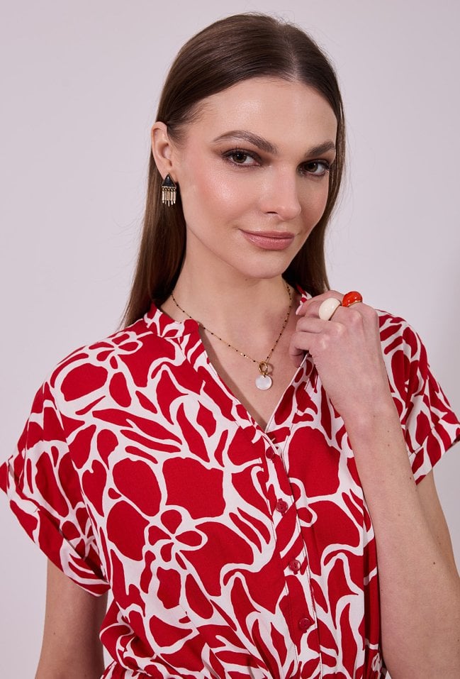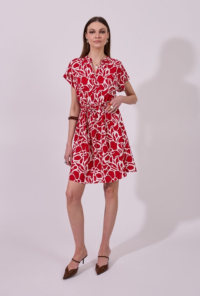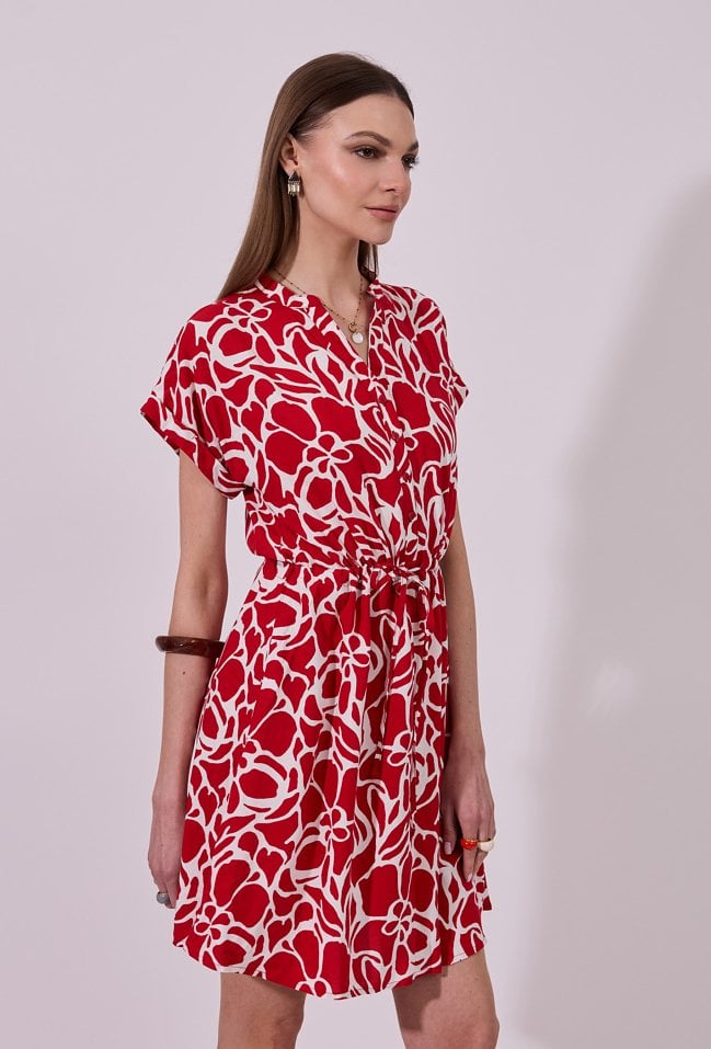 Sukienka damska o swobodnym, lekko rozkloszowanym kroju. Model o długości przed kolano z krótkim rękawem oraz dekoltem w kształcie litery V wykończonym subtelną stójką. Całość zdobi efektowny, graficzny wzór, który nadaje stylizacji nowoczesnego charakteru. Dodatkowym atutem są praktyczne kieszenie po bokach. Modelka na zdjęciu ma 177 cm wzrostu i prezentuje rozmiar 36.