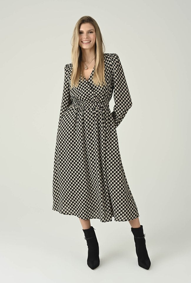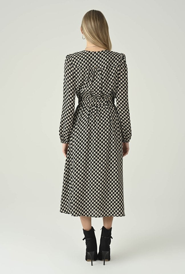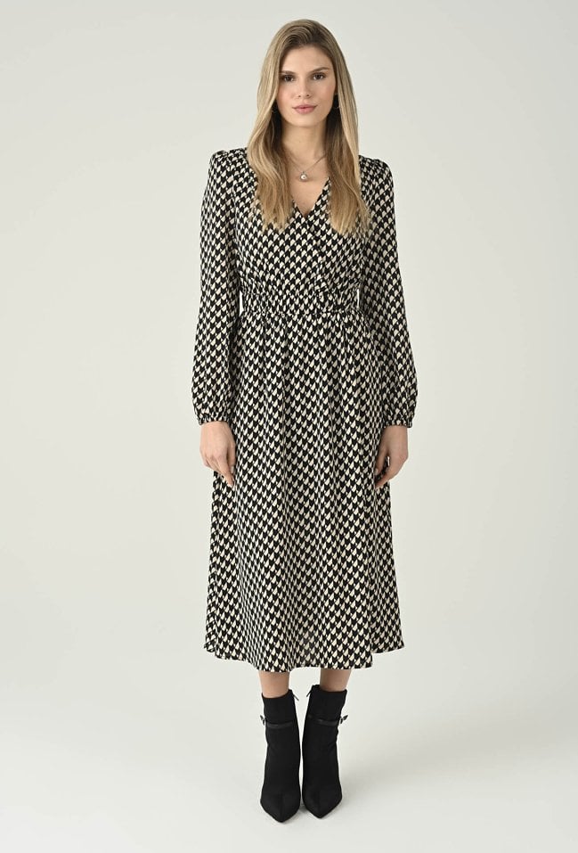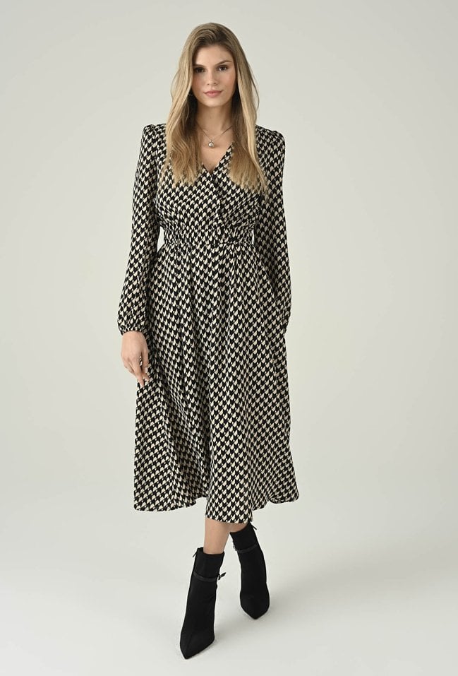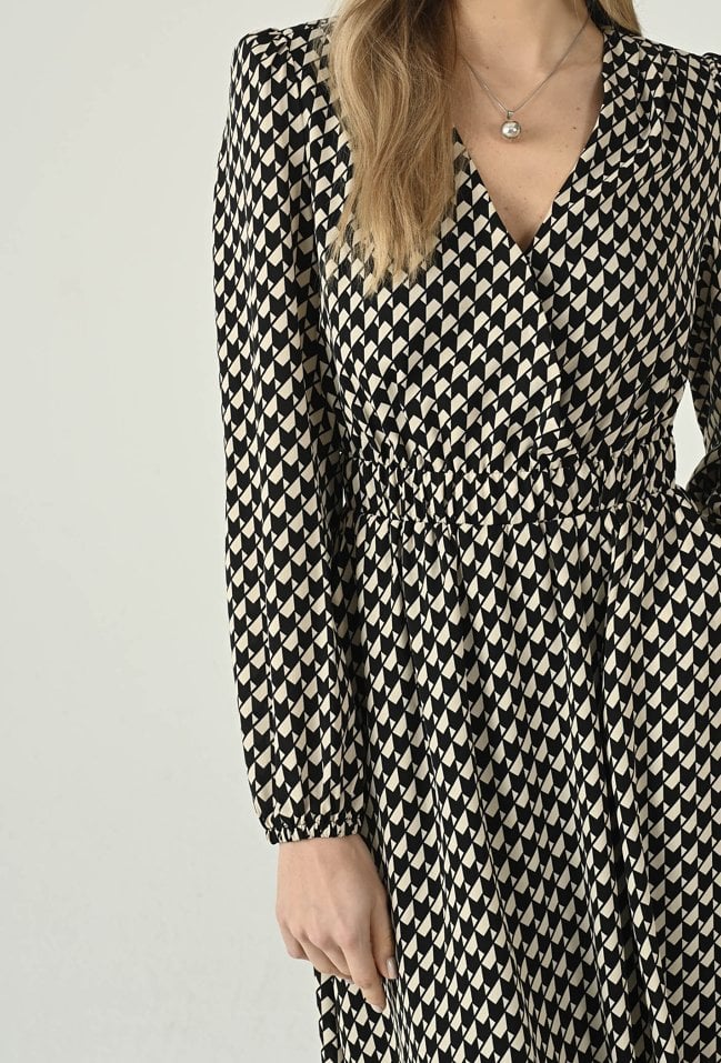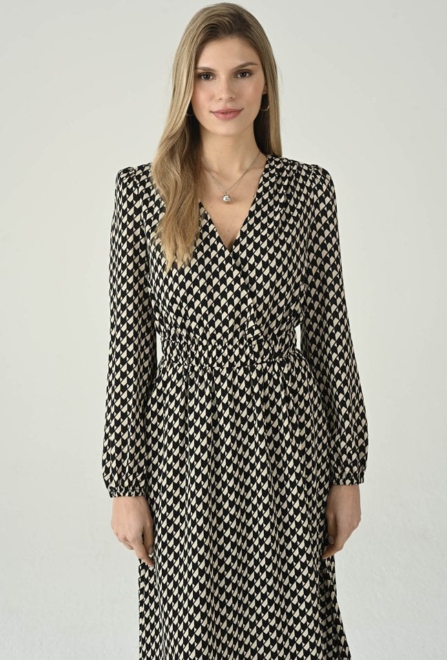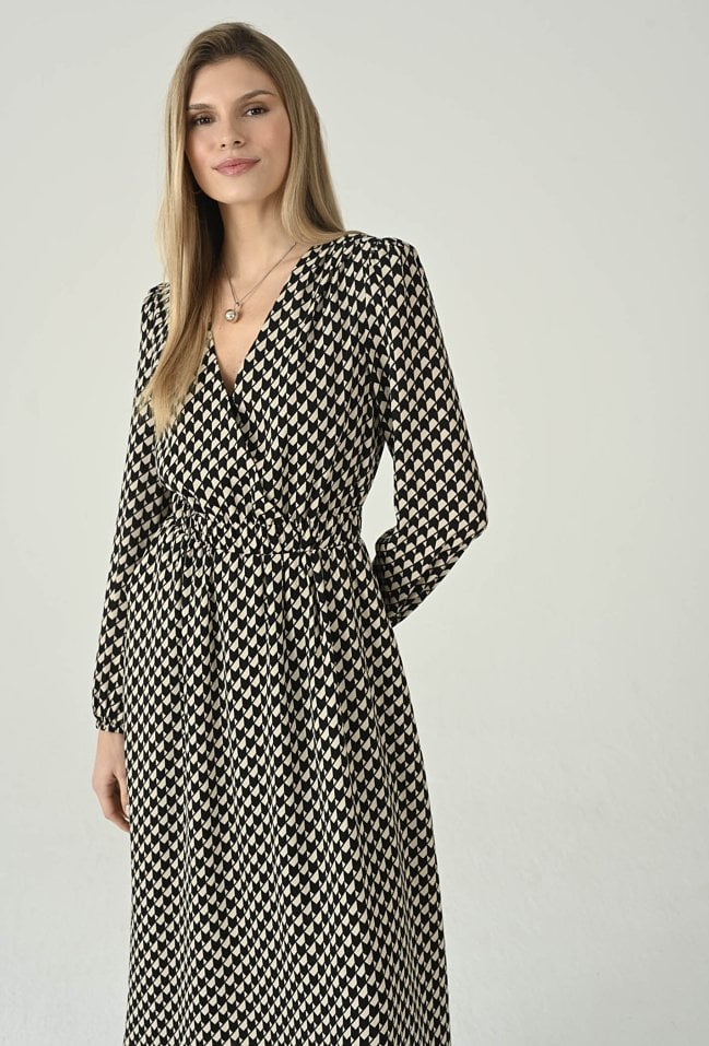 Kobieca sukienka za kolano w czarno-ecru drobny wzór, która łączy elegancję z komfortem noszenia. Kopertowy dekolt w kształcie litery V subtelnie podkreśla szyję, a zaznaczona talia pięknie modeluje sylwetkę i nadaje całości proporcji. Zwiewny dół miękko układa się w ruchu, tworząc lekki, stylowy efekt, a długie rękawy dodają całości szyku i sprawiają, że model świetnie sprawdzi się również w chłodniejsze dni. To idealna propozycja do pracy, na spotkania i wyjątkowe wyjścia — wystarczy dobrać botki, czółenka lub szpilki, by uzyskać dopracowany look.