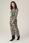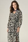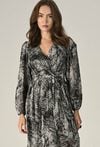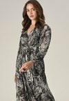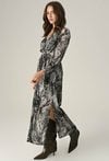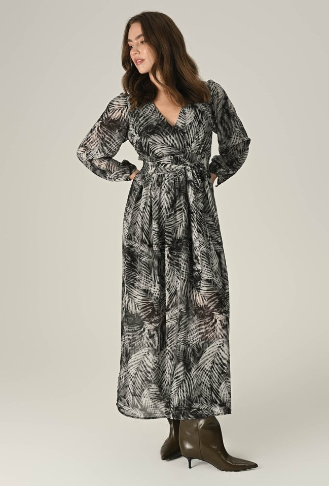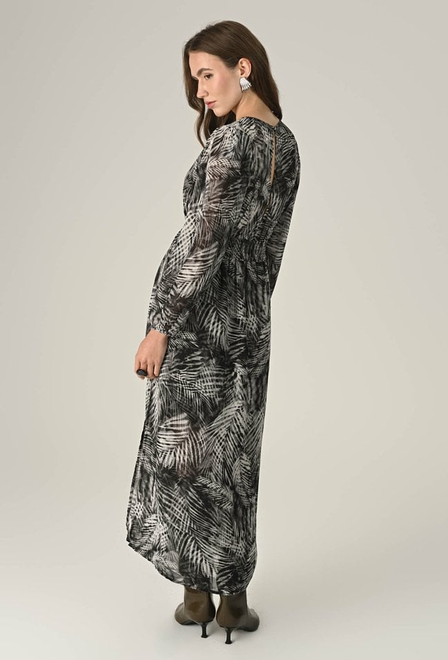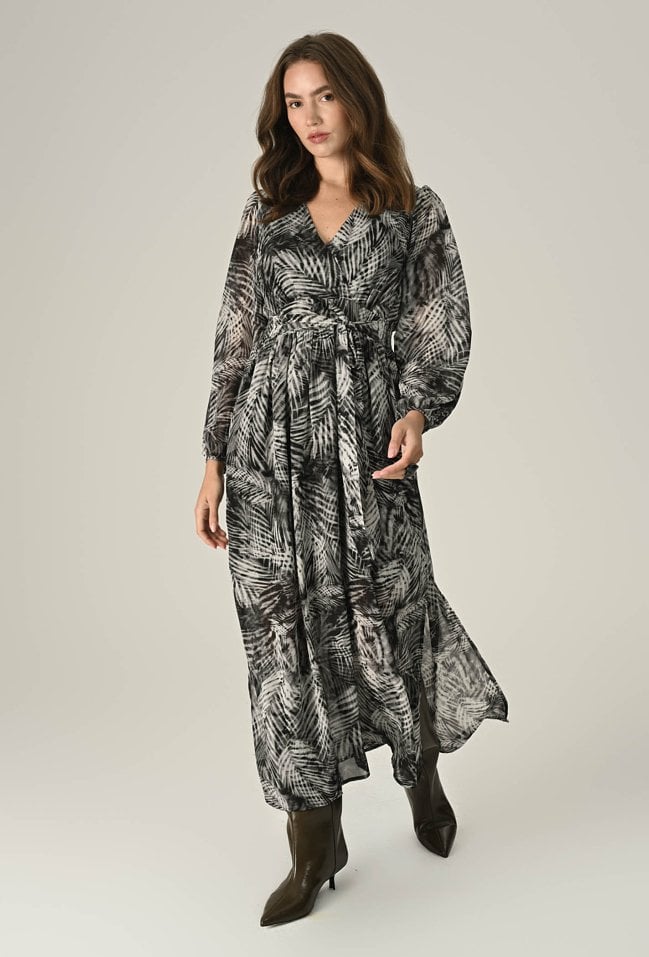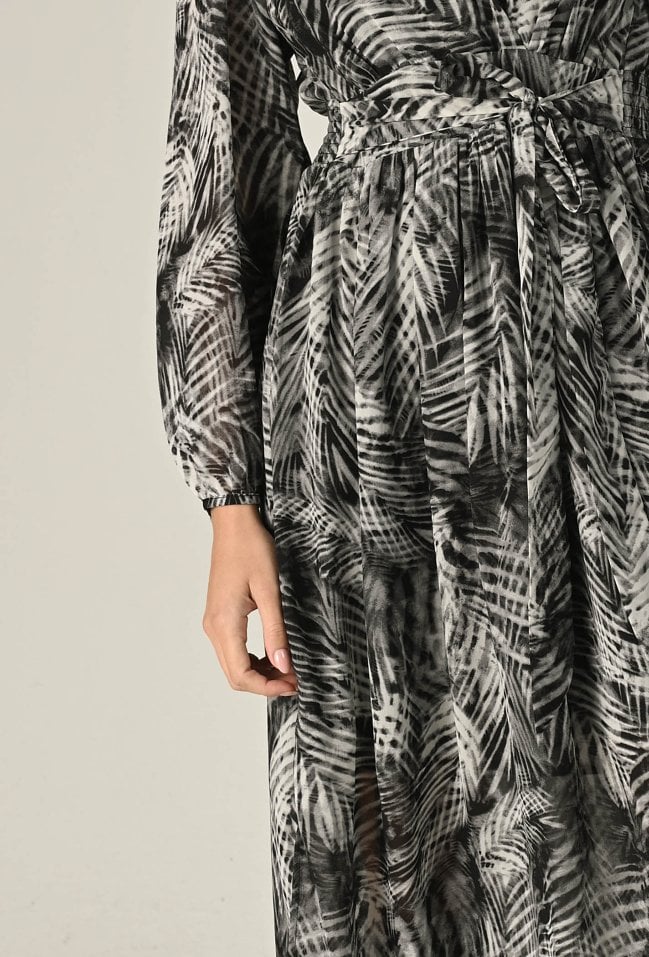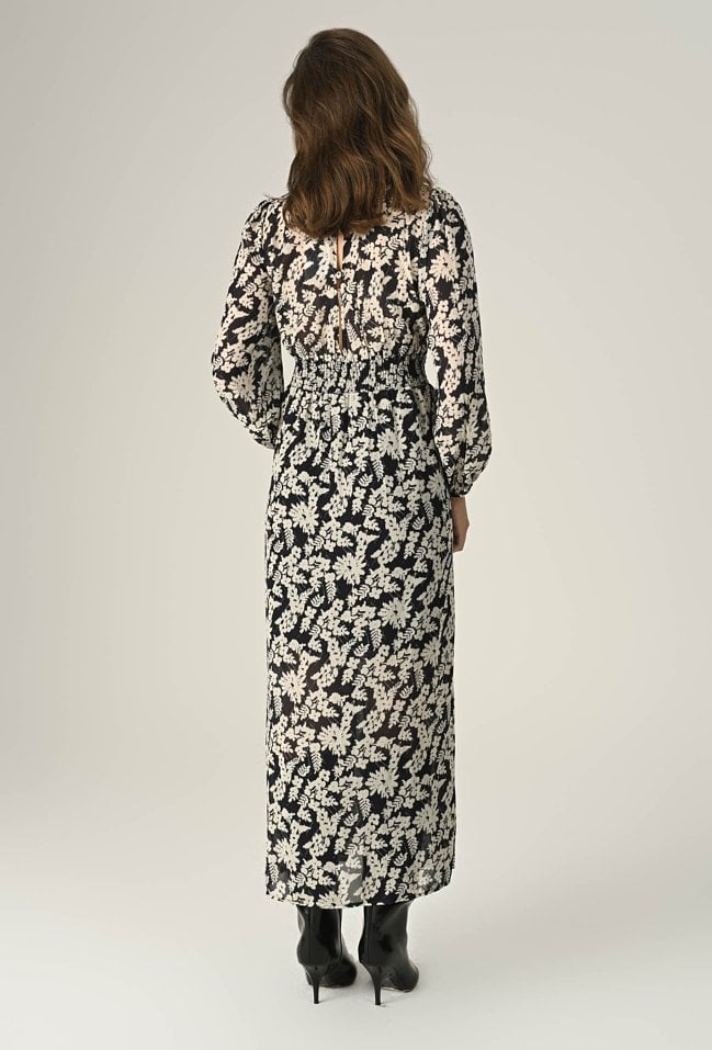 Długa sukienka wykonana z szyfonu w unikalnym princie, z elastyczną gumą w pasie, która subtelnie modeluje sylwetkę. Zapięcie na guzik z tyłu dodaje funkcjonalności i wygody. Perfekcyjna na eleganckie wyjścia, łącząc styl z komfortem. Modelka na zdjęciu ma 174 cm wzrostu i prezentuje rozmiar 36.