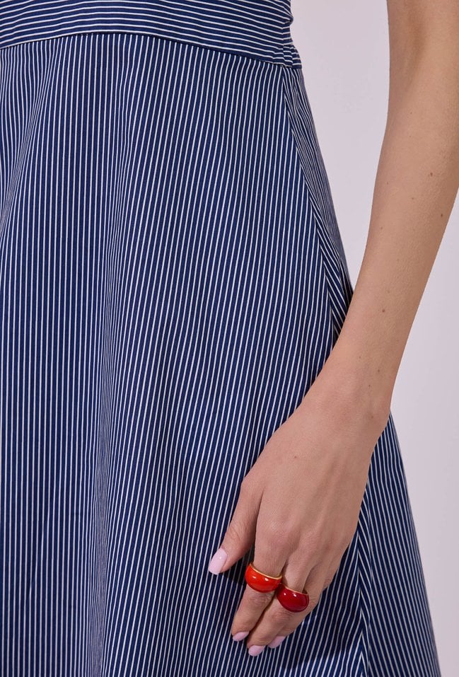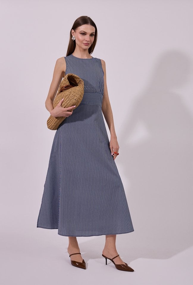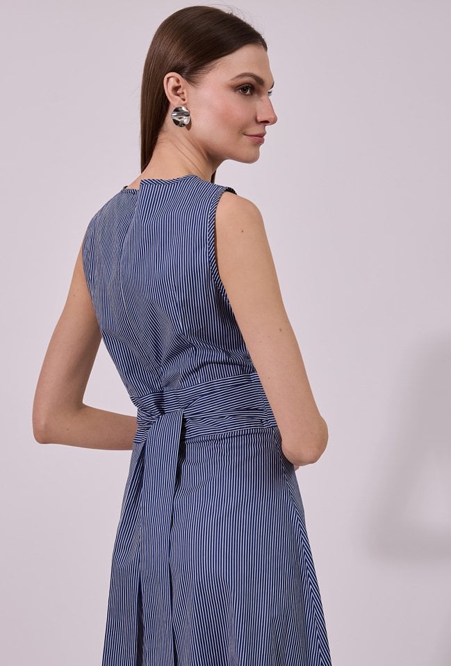 Sukienka damska o eleganckim, rozkloszowanym kroju maxi bez rękawów. Model z klasycznym, zabudowanym dekoltem, który nadaje całości minimalistycznego, ponadczasowego charakteru. W tylnej części zastosowano wiązanie, które podkreśla talię i pozwala na indywidualne dopasowanie fasonu. Modelka na zdjęciu ma 177 cm wzrostu i prezentuje rozmiar 36.