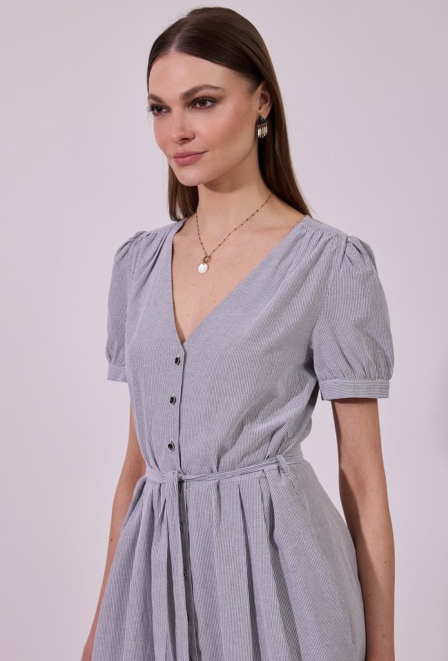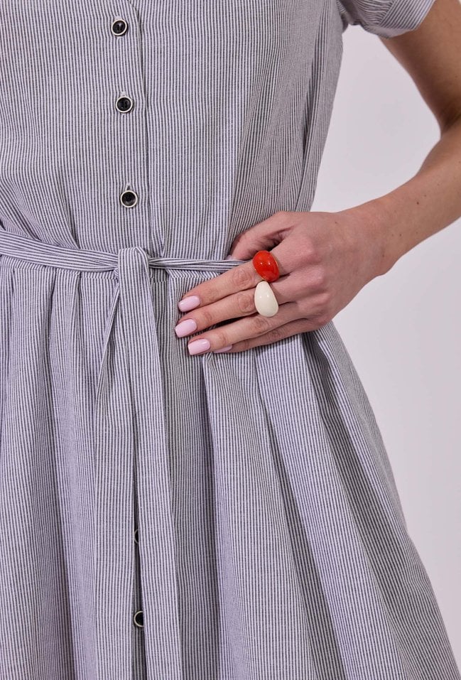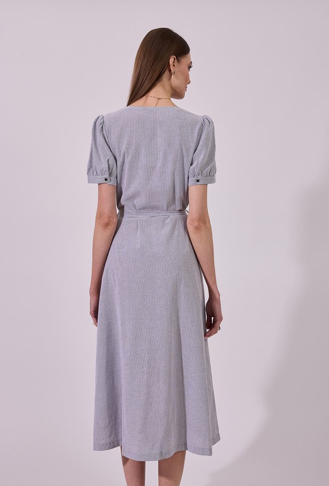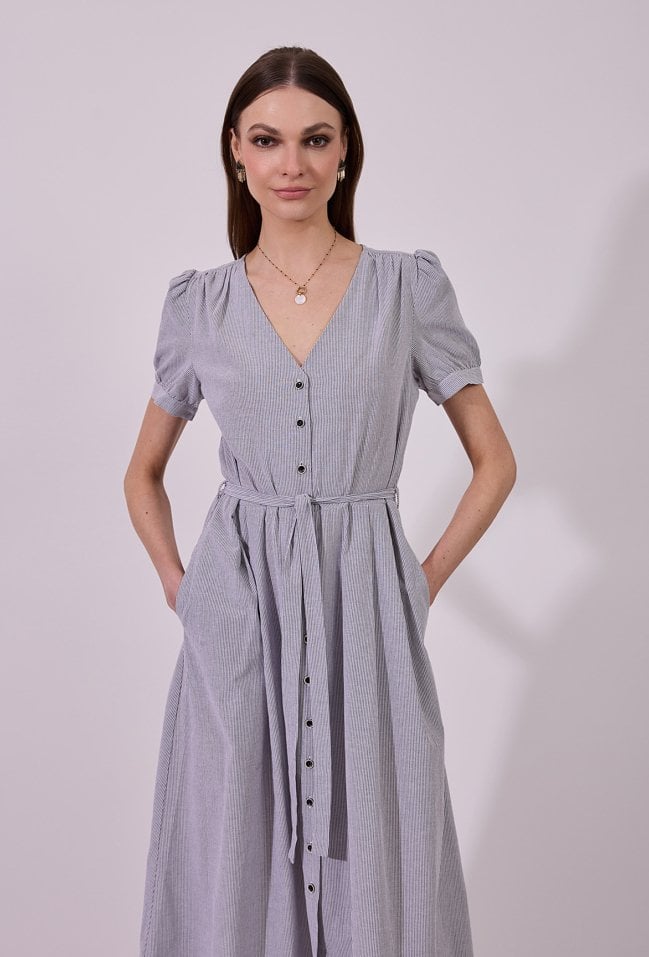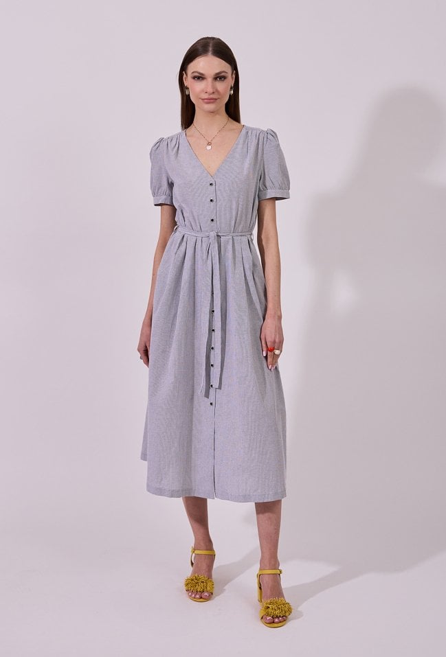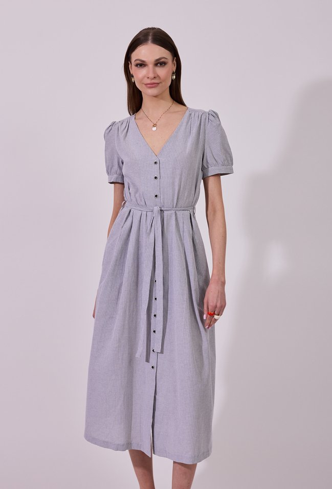 Sukienka damska o eleganckim, rozkloszowanym kroju midi z krótkim rękawem. Model z dekoltem w kształcie litery V oraz zapięciem na guziki na całej długości, który nadaje całości klasycznego charakteru. W talii zastosowano wiązanie, pozwalające na podkreślenie sylwetki i dopasowanie fasonu. Delikatne marszczenia przy ramionach dodają subtelnej objętości. Idealna zarówno do codziennych, jak i bardziej eleganckich stylizacji. Modelka na zdjęciu ma 177 cm wzrostu i prezentuje rozmiar 36.