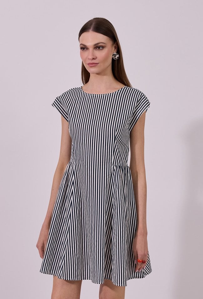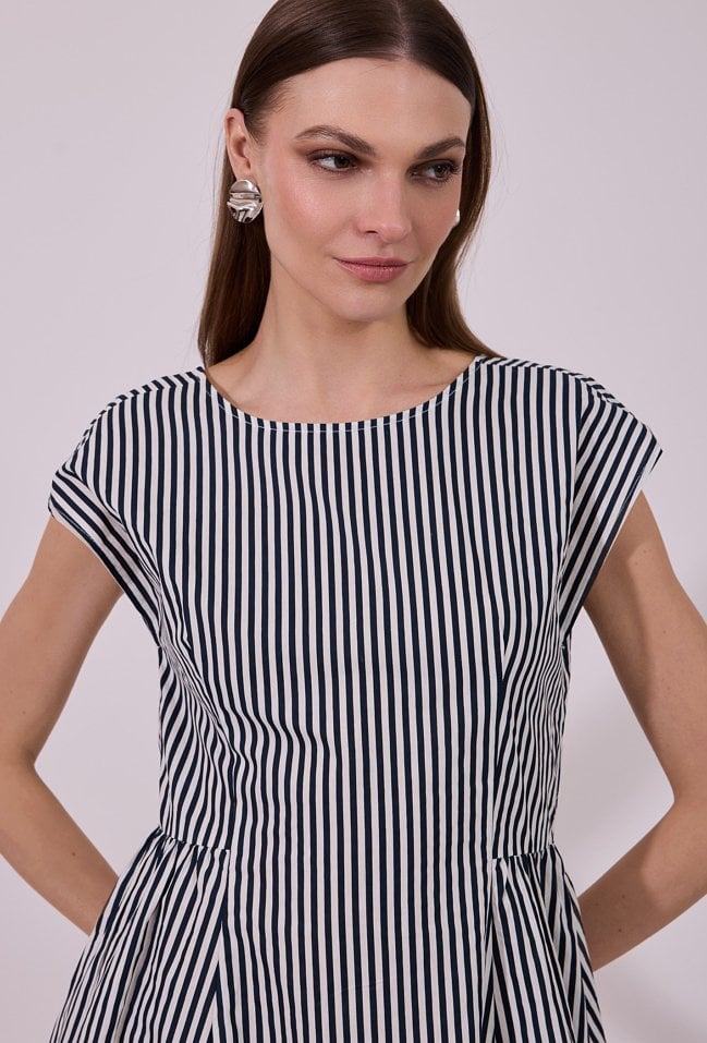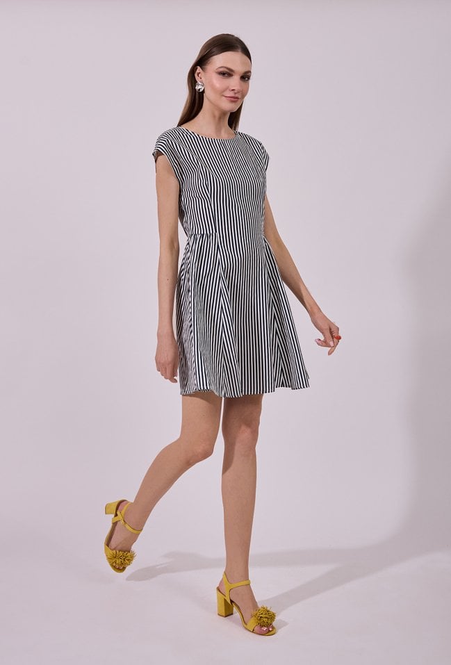 Sukienka damska o rozkloszowanym kroju mini z krótkim rękawem. Model z łódkowym dekoltem, który subtelnie podkreśla linię ramion. W talii delikatnie dopasowana, z rozkloszowanym dołem, pięknie układa się w ruchu. Całość zdobi klasyczny wzór w pionowe paski, który optycznie wysmukla sylwetkę. Modelka na zdjęciu ma 177 cm wzrostu i prezentuje rozmiar 36.