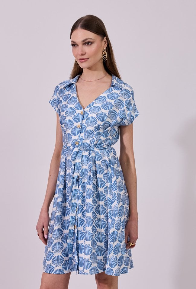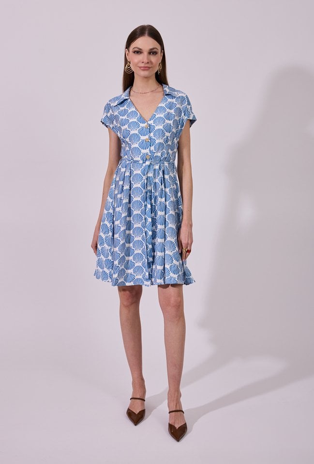 Sukienka damska o rozkloszowanym kroju mini z krótkim rękawem. W talii zastosowano wiązanie, pozwalające na podkreślenie sylwetki i dopasowanie fasonu. Lekki, przyjemny materiał zapewnia komfort noszenia, a subtelny wzór dodaje stylizacji świeżości. Modelka na zdjęciu ma 177 cm wzrostu i prezentuje rozmiar S.