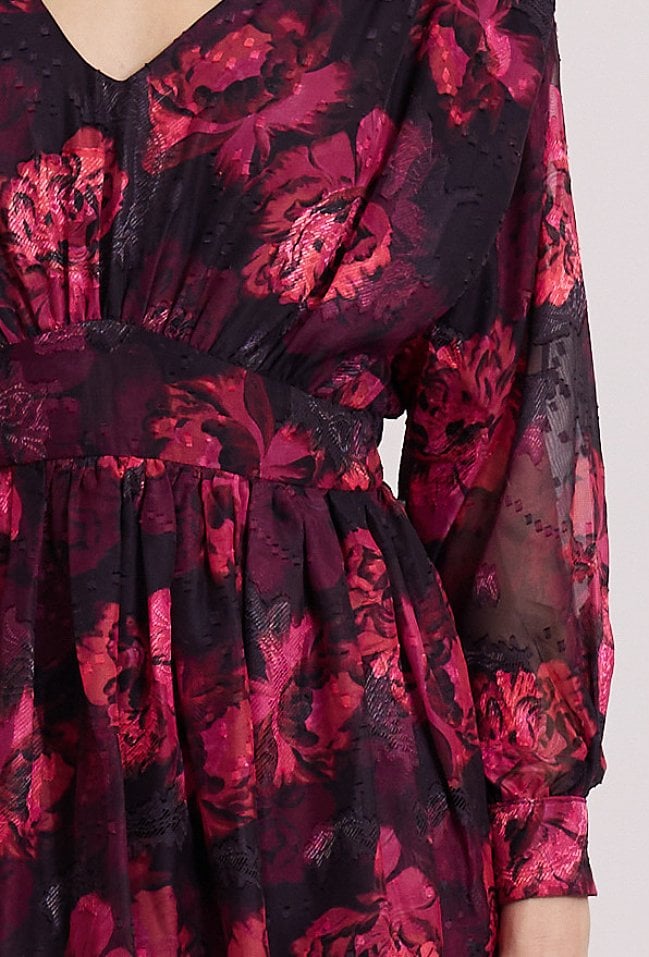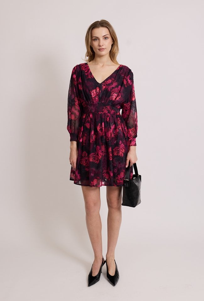 Elegancka sukienka damska mini z długim rękawem. Model z dekoltem w kształcie litery V oraz delikatnym, kwiatowym wzorem, wykonany z lekkiego, transparentnego materiału. Sukienka doskonale sprawdzi się na przyjęcia, spotkania oraz wieczorne wyjścia, podkreślając kobiecy i stylowy charakter. Modelka na zdjęciu ma 177 cm wzrostu i prezentuje rozmiar 36.