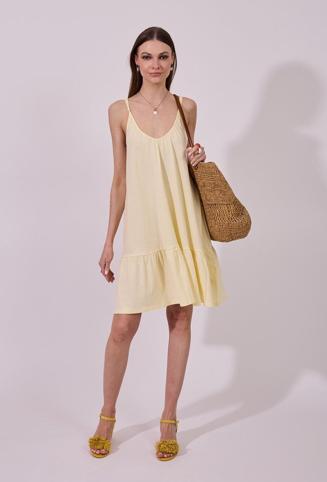 Sukienka damska o lekkim, zwiewnym kroju na cienkich ramiączkach. Model z dekoltem w kształcie litery V. Dół wykończony falbaną dodaje lekkości i swobody ruchu. Wykonana z przyjemnego, przewiewnego materiału, idealnie sprawdzi się w letnich, codziennych stylizacjach oraz podczas wakacyjnych wyjazdów. Modelka na zdjęciu ma 177 cm wzrostu i prezentuje rozmiar S.
