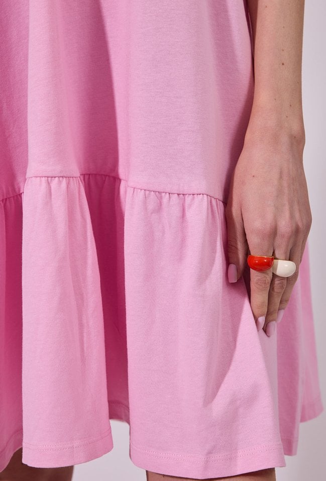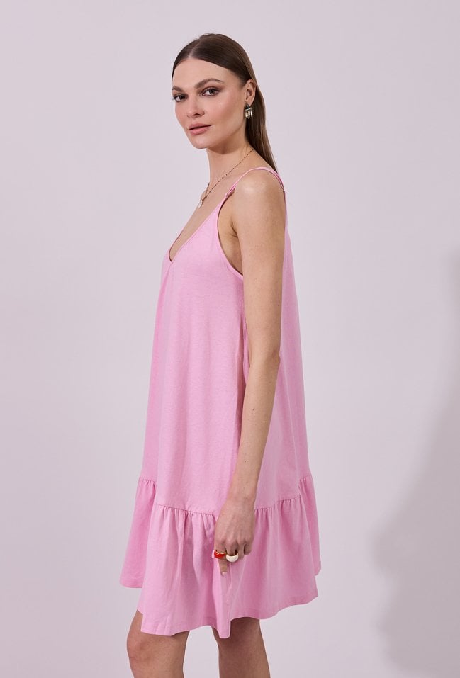 Sukienka damska o lekkim, zwiewnym kroju na cienkich ramiączkach. Model z dekoltem w kształcie litery V. Dół wykończony falbaną dodaje lekkości i swobody ruchu. Wykonana z przyjemnego, przewiewnego materiału, idealnie sprawdzi się w letnich, codziennych stylizacjach oraz podczas wakacyjnych wyjazdów. Modelka na zdjęciu ma 177 cm wzrostu i prezentuje rozmiar S.