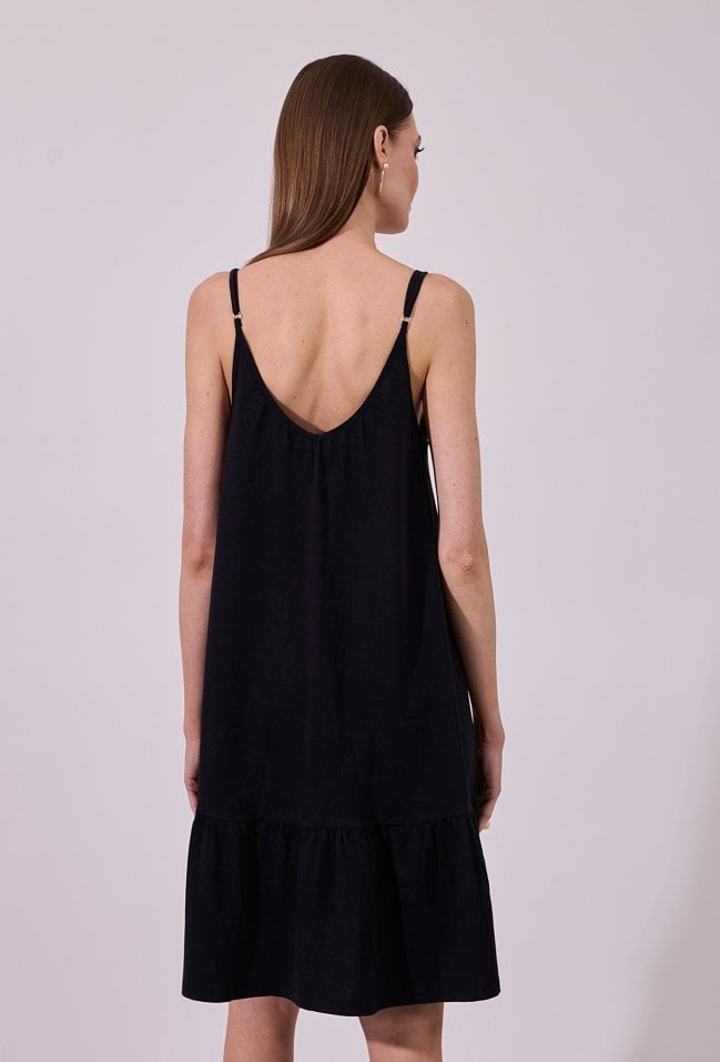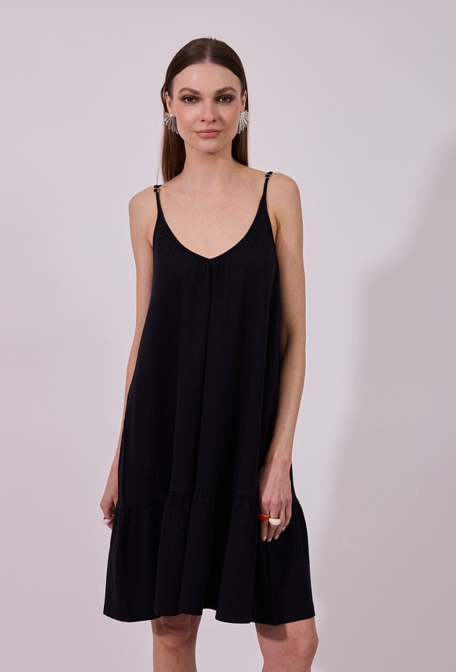 Sukienka damska o lekkim, zwiewnym kroju na cienkich ramiączkach. Model z dekoltem w kształcie litery V. Dół wykończony falbaną dodaje lekkości i swobody ruchu. Wykonana z przyjemnego, przewiewnego materiału, idealnie sprawdzi się w letnich, codziennych stylizacjach oraz podczas wakacyjnych wyjazdów. Modelka na zdjęciu ma 177 cm wzrostu i prezentuje rozmiar S.