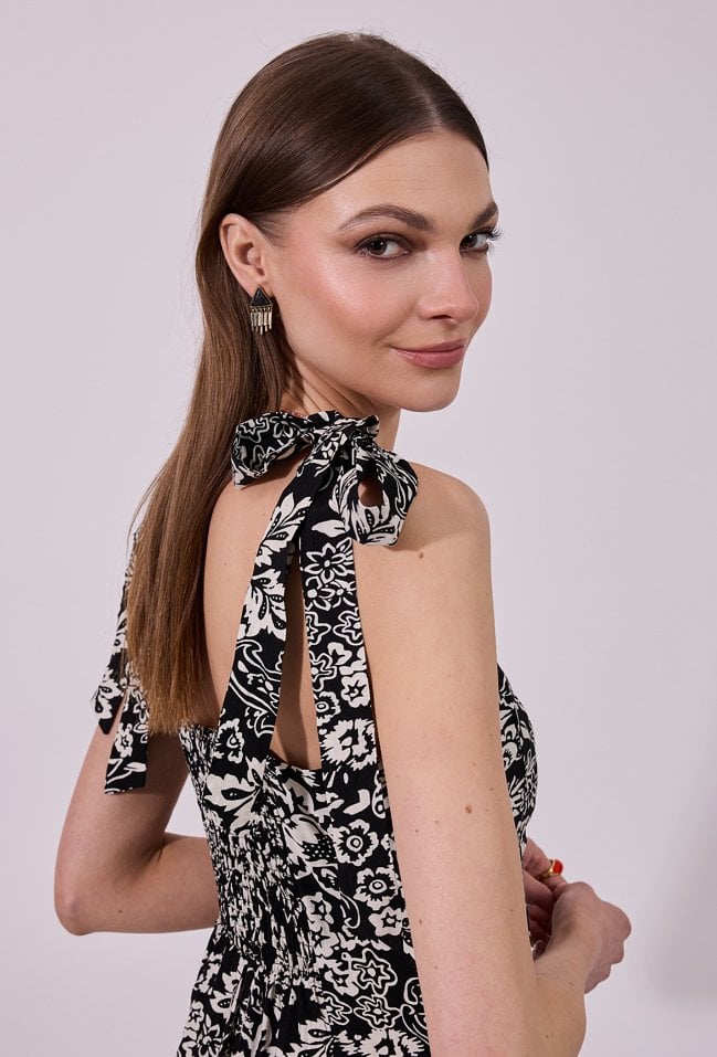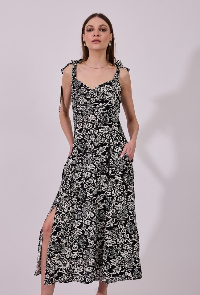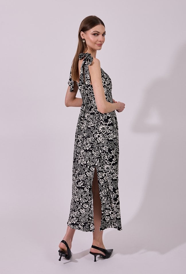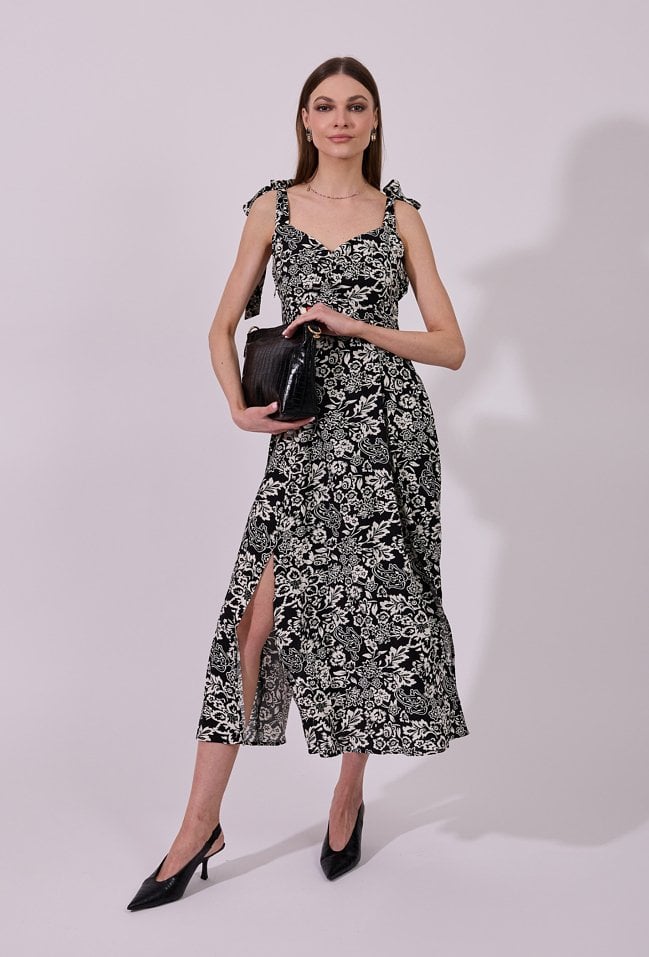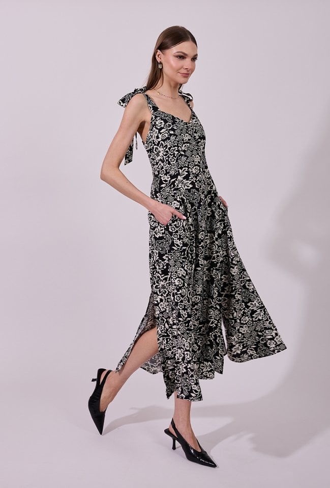 Sukienka damska midi na ramiączkach. Model z dekoltem w kształcie serca oraz wiązanymi ramiączkami, które nadają całości kobiecego i romantycznego charakteru. W talii delikatnie dopasowana, podkreśla sylwetkę, a rozcięcie na nodze dodaje lekkości i subtelnej zmysłowości. Idealna na letnie wyjścia i wyjątkowe okazje. Modelka na zdjęciu ma 177 cm wzrostu i prezentuje rozmiar 36.
