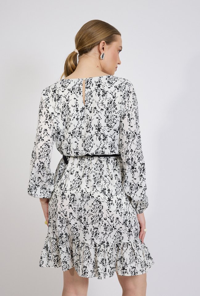 Sukienka damska o lekkim, kobiecym kroju. Model o długości przed kolano z długim rękawem zakończonym delikatnym marszczeniem oraz dekoltem w kształcie litery V, który subtelnie podkreśla linię szyi. Dół sukienki wykończony jest falbaną, która nadaje stylizacji lekkości i ruchu. Całość zdobi subtelny, kwiatowy wzór. Modelka na zdjęciu ma 177 cm wzrostu i prezentuje rozmiar 36.
