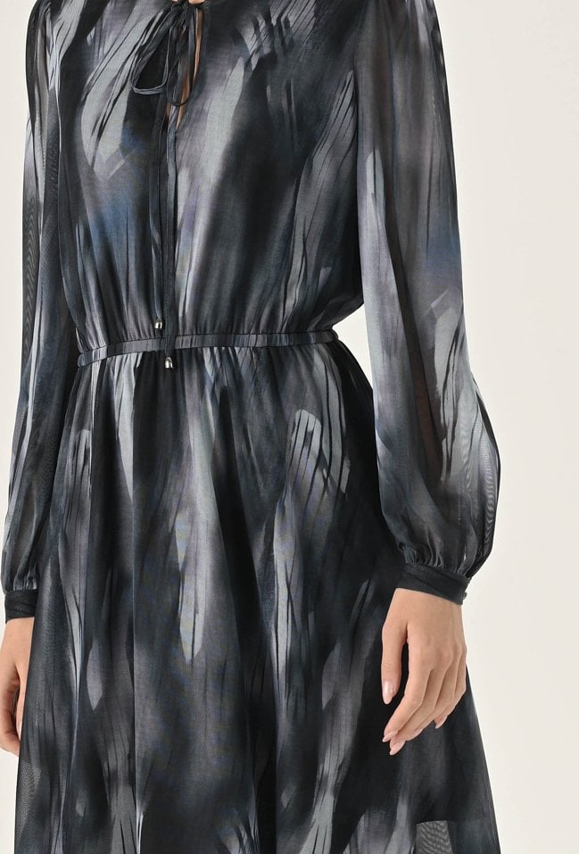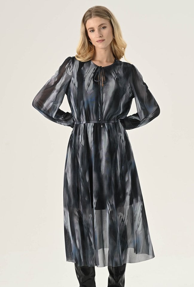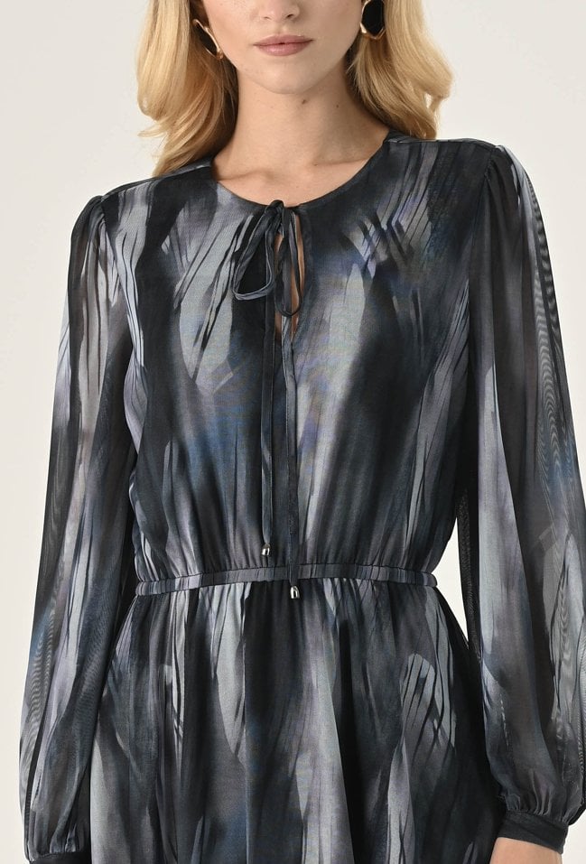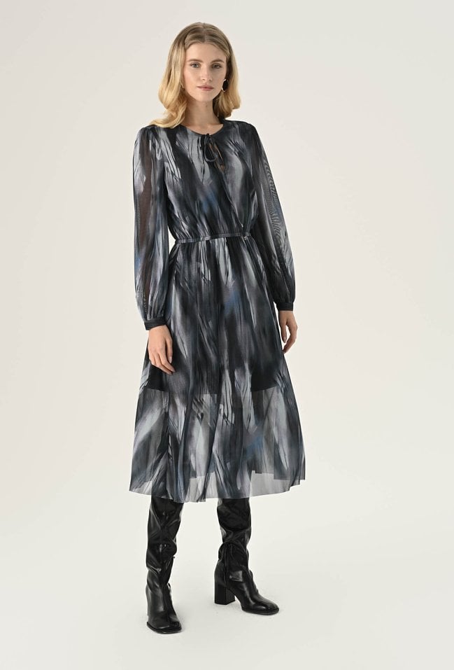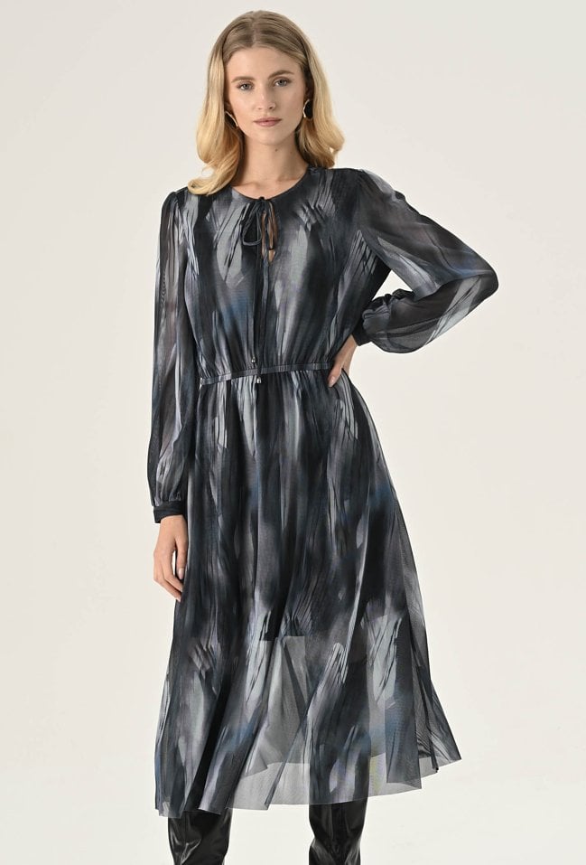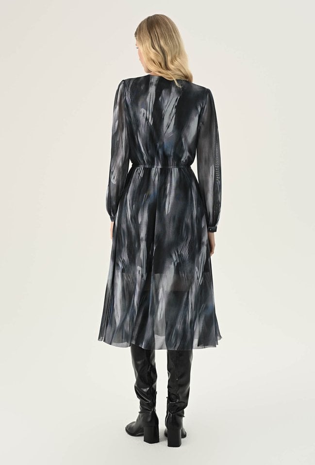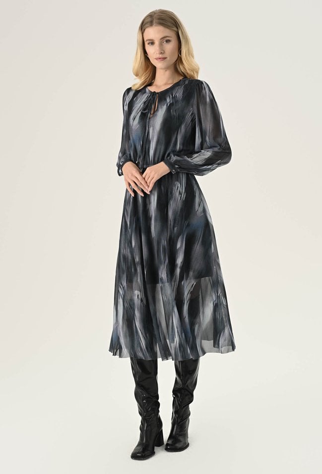 Stylowa midi sukienka wykonana z dzianiny z subtelnym połyskiem dzięki metalicznej nici. Elegancki dekolt typu woda nadaje całości kobiecego charakteru, a dołączony pasek pięknie podkreśla talię. Praktyczne kieszenie po bokach dodają funkcjonalności i luzu. Idealna na wieczorne wyjścia, uroczystości i inne wyjątkowe okazje. Modelka na zdjęciu ma 177 cm wzrostu i prezentuje rozmiar 36.