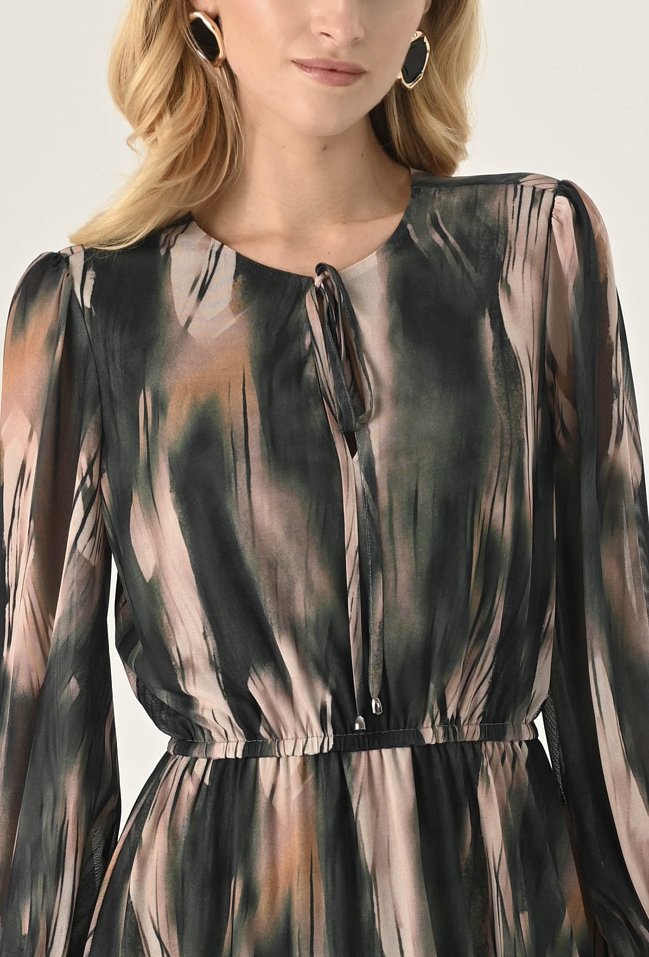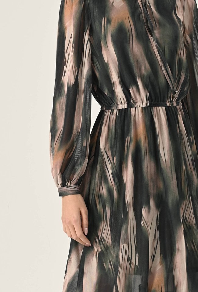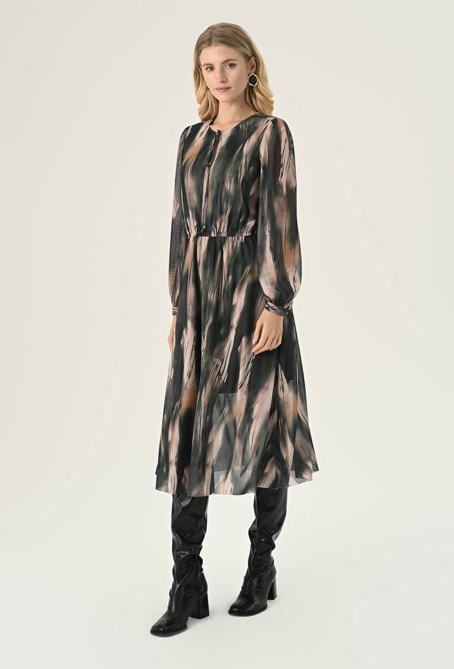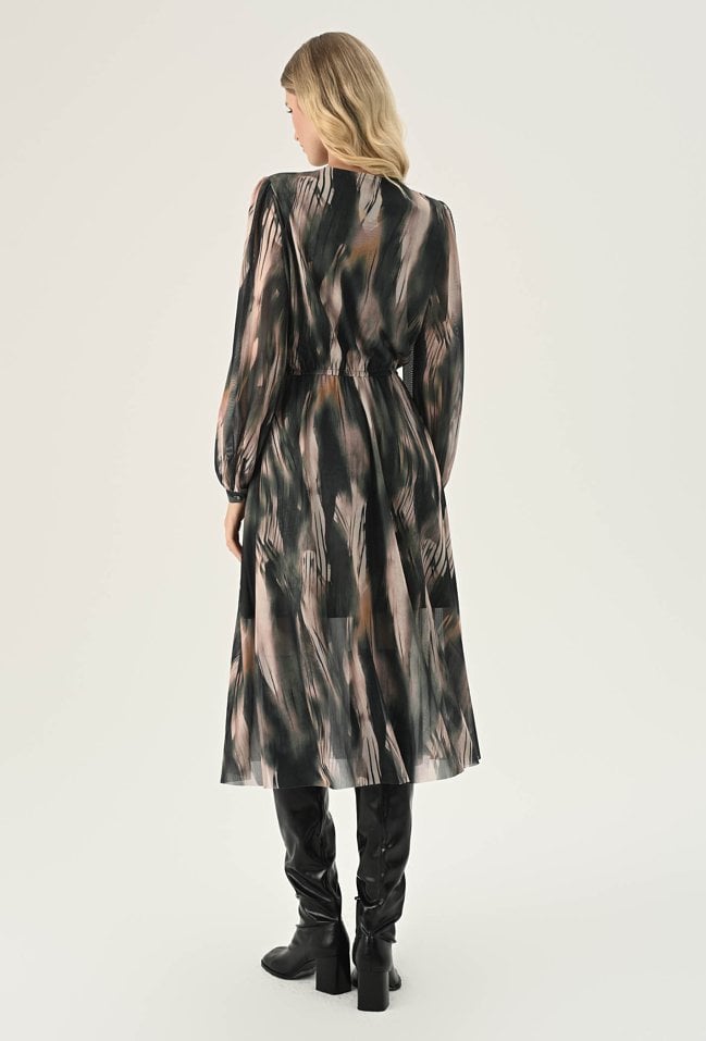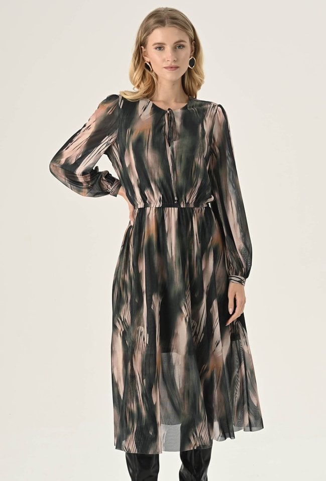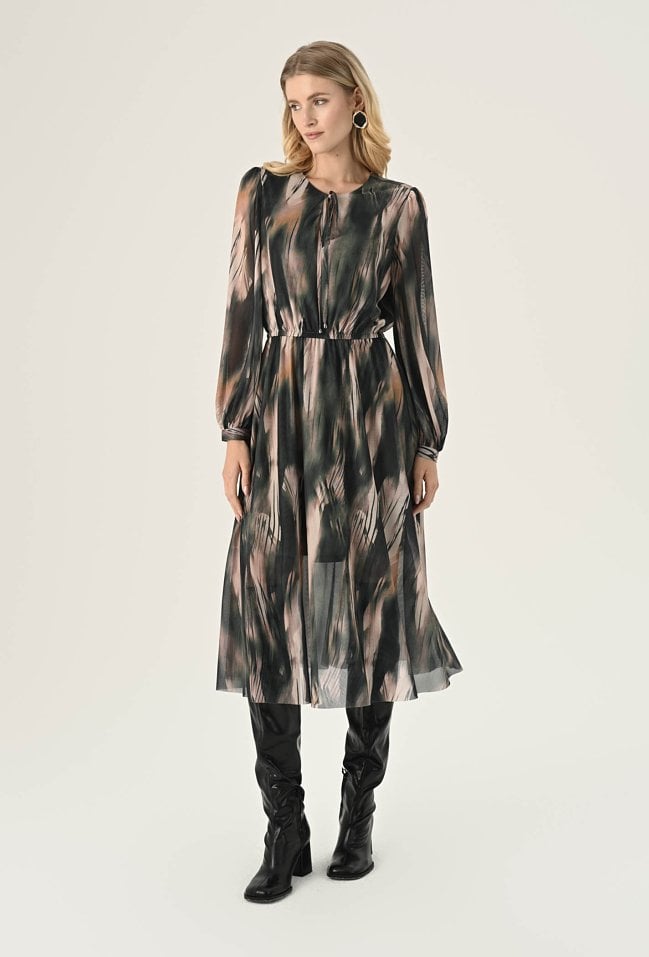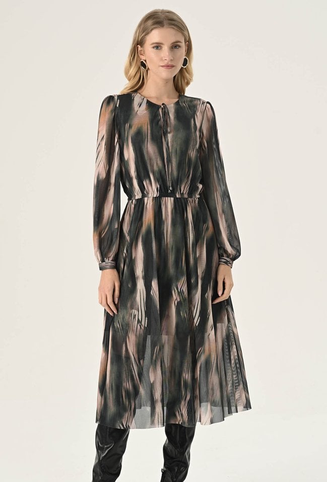 Stylowa midi sukienka wykonana z dzianiny z subtelnym połyskiem dzięki metalicznej nici. Elegancki dekolt typu woda nadaje całości kobiecego charakteru, a dołączony pasek pięknie podkreśla talię. Praktyczne kieszenie po bokach dodają funkcjonalności i luzu. Idealna na wieczorne wyjścia, uroczystości i inne wyjątkowe okazje. Modelka na zdjęciu ma 177 cm wzrostu i prezentuje rozmiar 36.