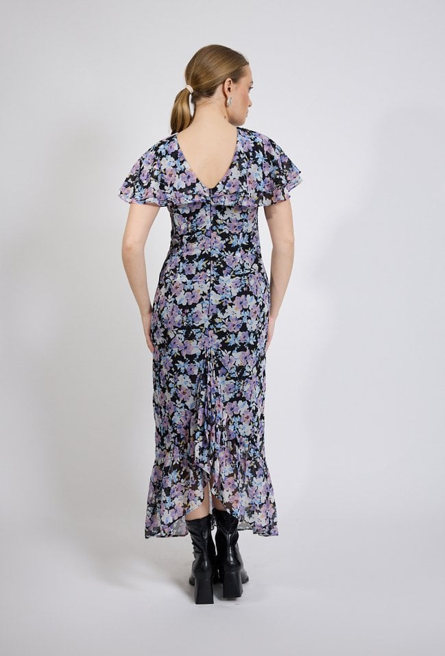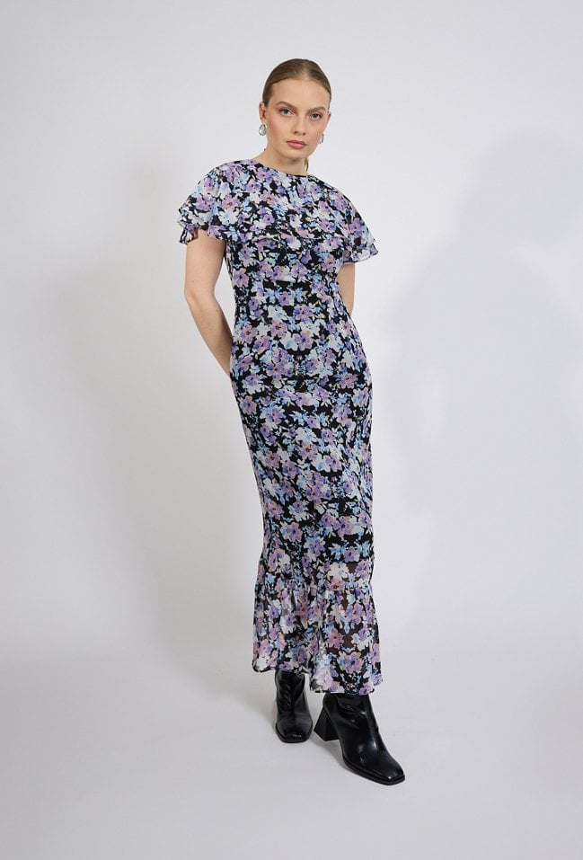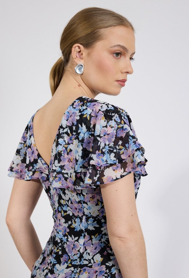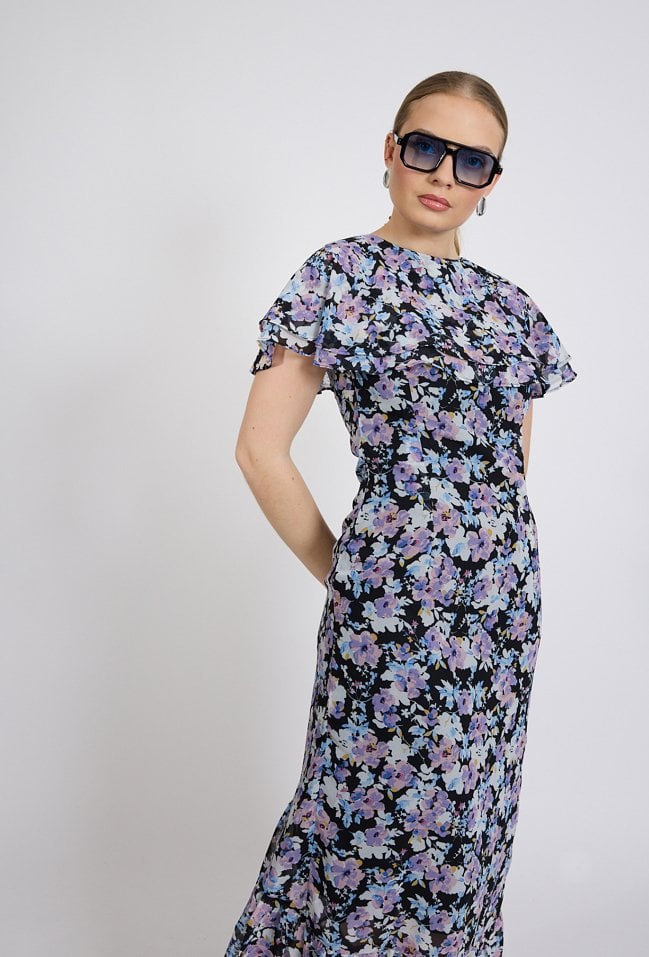 Sukienka damska o dopasowanym, kobiecym kroju. Model o długości maxi z krótkim, falbaniastym rękawem oraz klasycznym, półokrągłym dekoltem. Talię podkreśla dopasowany fason, który pięknie modeluje sylwetkę. Sukienka damska doskonale sprawdzi się w stylizacjach na wyjątkowe okazje oraz w bardziej wyrazistych zestawach na co dzień. Modelka na zdjęciu ma 177 cm wzrostu i prezentuje rozmiar 36.