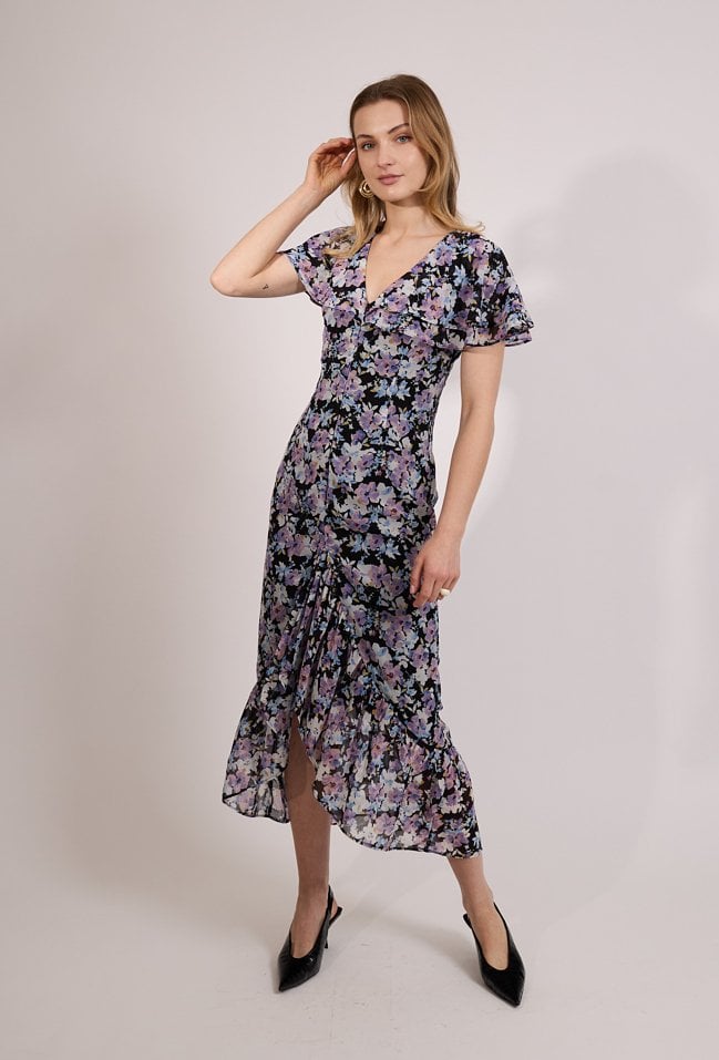 Sukienka damska o dopasowanym, kobiecym kroju. Model o długości maxi z krótkim, falbaniastym rękawem oraz klasycznym dekoltem w serek. Talię podkreśla dopasowany fason, który pięknie modeluje sylwetkę. Sukienka damska doskonale sprawdzi się w stylizacjach na wyjątkowe okazje oraz w bardziej wyrazistych zestawach na co dzień. Modelka na zdjęciu ma 177 cm wzrostu i prezentuje rozmiar 36.