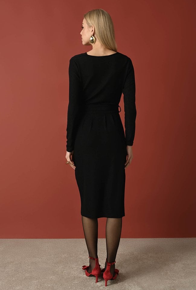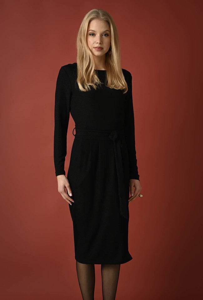 Kobieca, dopasowana sukienka w klasycznym czarnym kolorze z połyskującą nicią będzie doskonałym wyborem na specjalne okazje i rodzinne przyjęcia. Okrągły dekolt oraz wiązanie w tali sprawiają, że sukienka jest zarówno zmysłowa, jak i kobieca, a przylegający fason pięknie podkreśla sylwetkę. To bez wątpienia model z efektem "wow" z naszej najpiękniejszej kolekcji EVENING! Modelka na zdjęciu ma 177 cm wzrostu i nosi rozmiar 36.