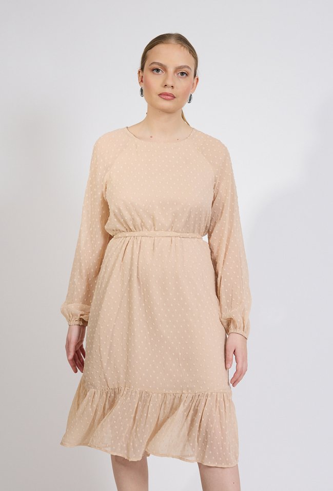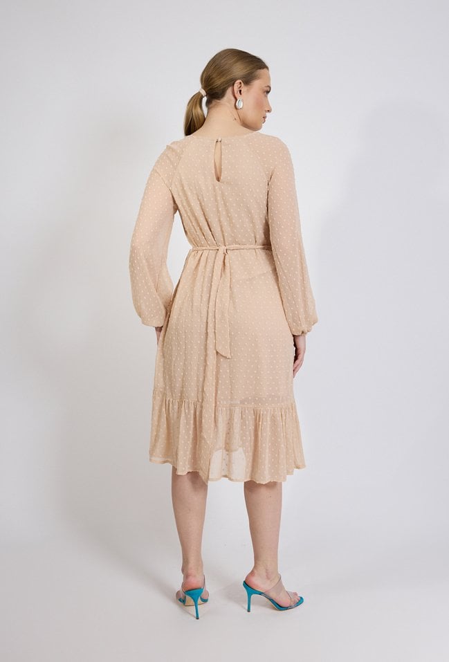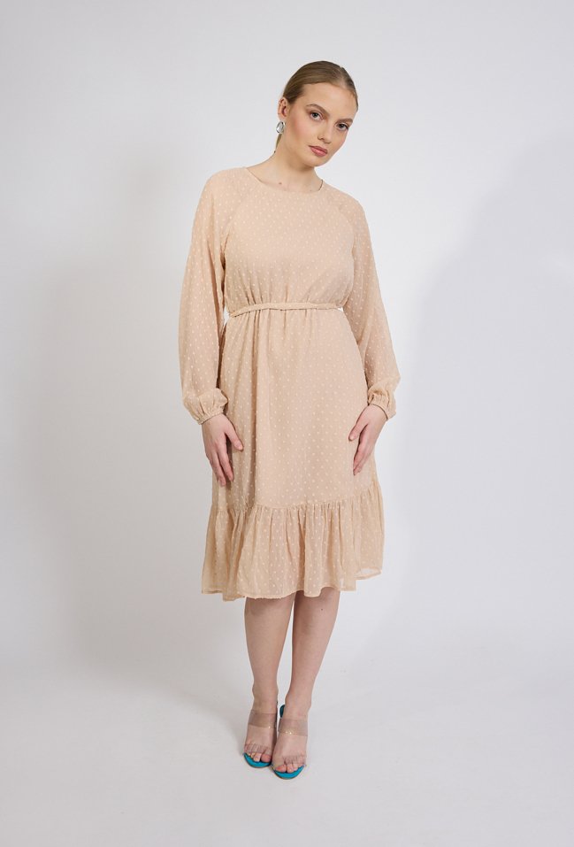 Sukienka damska o lekkim, kobiecym kroju. Model o długości midi z długim rękawem zakończonym elastycznym mankietem oraz klasycznym, półokrągłym dekoltem. Talia podkreślona wiązaniem, które pozwala na dopasowanie sukienki do sylwetki. Sukienka idealnie sprawdzi się na wyjątkowe okazje, w połączeniu ze szpilkami lub balerinami. Modelka na zdjęciu ma 177 cm wzrostu i prezentuje rozmiar 36.