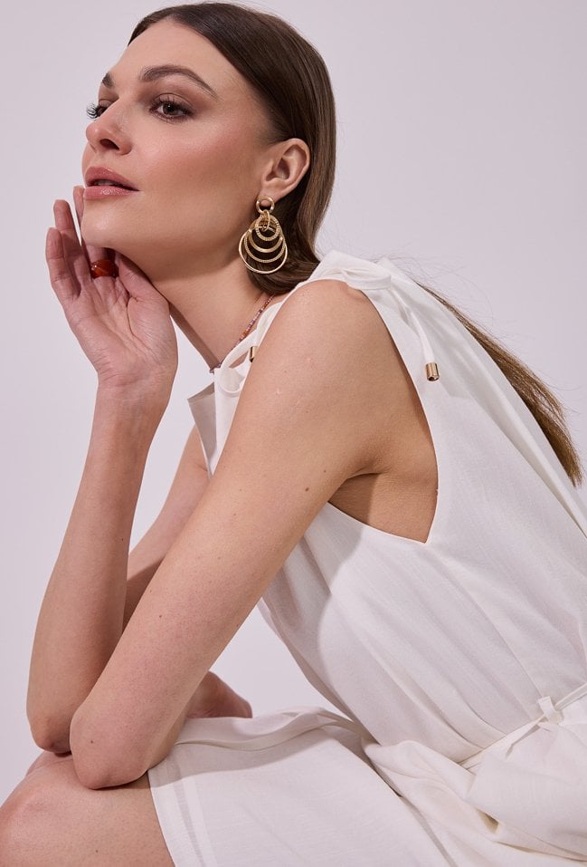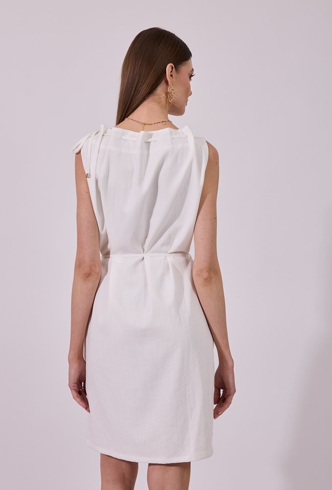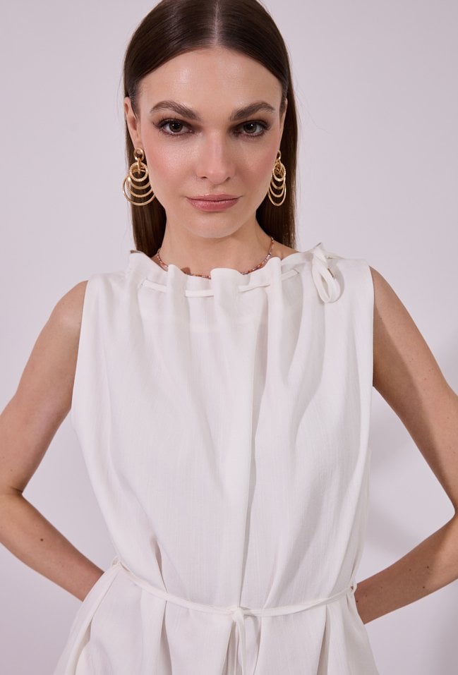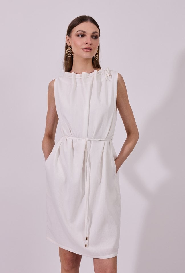 Sukienka damska o prostym, swobodnym kroju bez rękawów. Model z zabudowanym dekoltem oraz dekoracyjnymi troczkami przy szyi, które nadają całości nowoczesnego charakteru. W talii zastosowano wiązanie, pozwalające na podkreślenie sylwetki i indywidualne dopasowanie. Modelka na zdjęciu ma 177 cm wzrostu i prezentuje rozmiar 36.